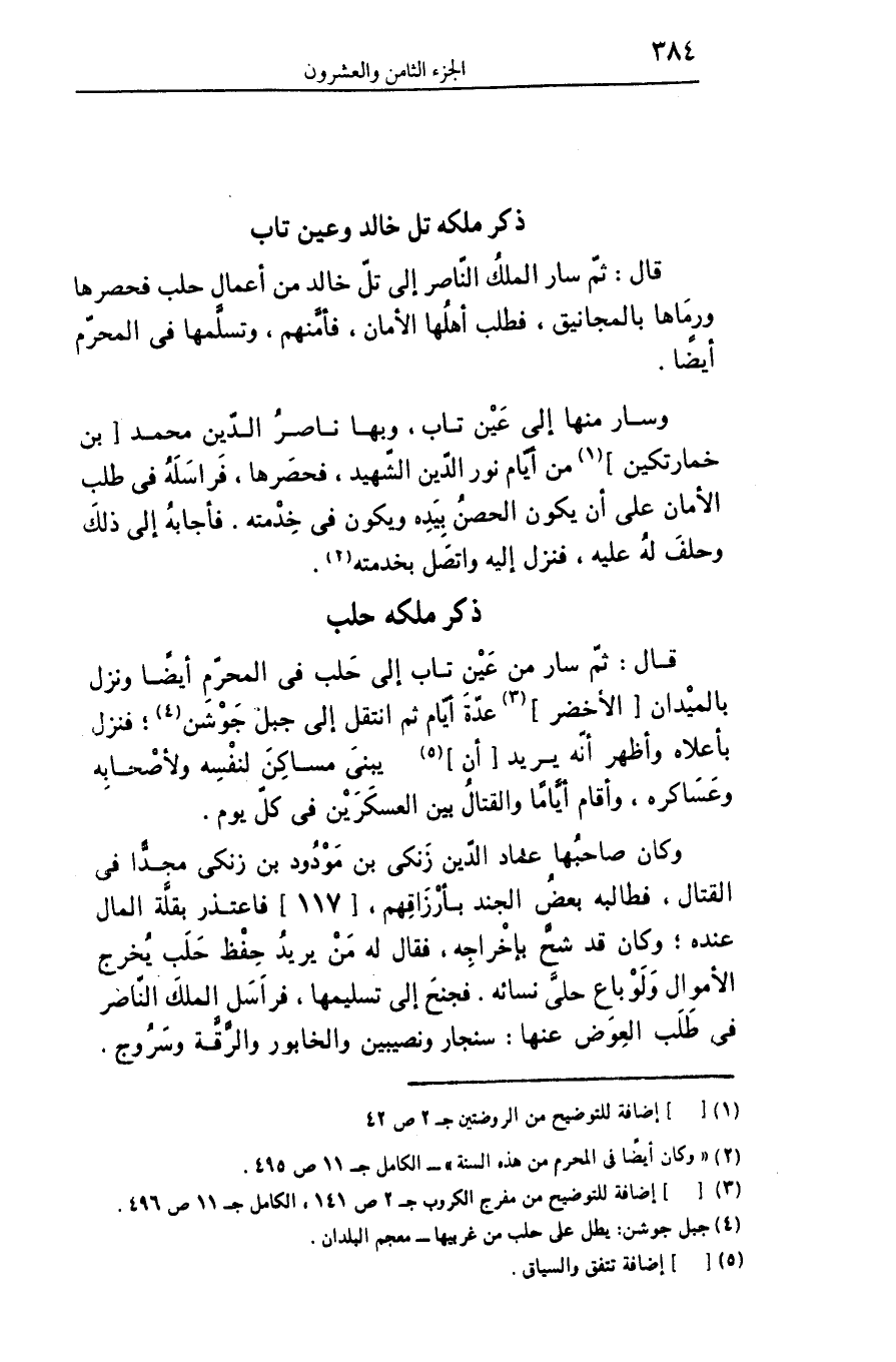وكان صاحبها عماد الدّين زنكى بن مودود بن زنكى مجدّا فى القتال، فطالبه بعض الجند بأرزاقهم، [117] فاعتذر بقلّة المال عنده؛ وكان قد شحّ بإخراجه، فقال له من يريد حفظ حلب يخرج الأموال ولو باع حلىّ نسائه. فجنح إلى تسليمها، فراسل الملك النّاصر فى طلب العوض عنها: سنجار ونصيبين والخابور والرّقّة وسروج.