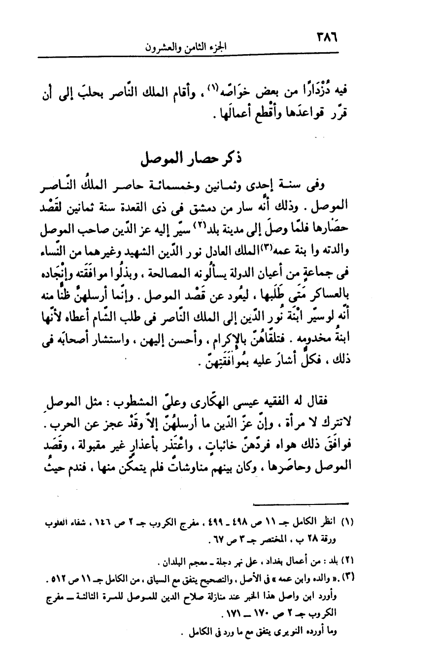 وفى سنة إحدى وثمانين وخمسمائة حاصر الملك النّاصر الموصل. وذلك أنّه سار من دمشق فى ذى القعدة سنة ثمانين لقصد حصارها فلمّا وصل إلى مدينة بلد «2» سيّر إليه عز الدّين صاحب الموصل والدته وابنة عمه «3» الملك العادل نور الدّين الشهيد وغيرهما من النّساء فى جماعة من أعيان الدولة يسألونه المصالحة، وبذلوا موافقته وإنجاده بالعساكر متى طلبها، ليعود عن قصد الموصل. وإنّما أرسلهنّ ظنّا منه أنّه لو سيّر ابنة نور الدّين إلى الملك النّاصر فى طلب الشّام أعطاه لأنّها ابنة مخدومه. فتلقّاهنّ بالإكرام، وأحسن إليهن، واستشار أصحابه فى ذلك، فكلّ أشار عليه بموافقتهنّ.