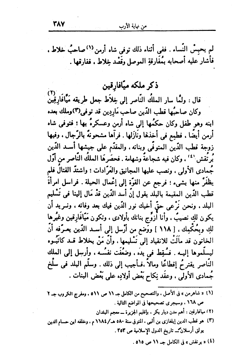 قال: ولمّا سار الملك النّاصر إلى خلاط جعل طريقه ميّافارقين «2» وكان صاحبها قطب الدّين صاحب ماردين قد توفى «3» وملك بعده ابنه وهو طفل وكان حكمها إلى شاه أرمن وعسكره بها؛ فتوفى شاه أرمن أيضا، فطمع فى أخذها ونازلها. فرآها مشحونة بالرّجال، وفيها زوجة قطب الدّين المتوفّى وبناته، والمقدّم على جيشها أسد الدّين برتقش «4» ، وكان فيه شجاعة وشهامة. فحصرها الملك النّاصر من أوّل جمادى الأولى، ونصب عليها المجانيق والعرّادات؛ واشتدّ القتال فلم يظفر منها بشىء؛ فرجع عن القوّة إلى إعمال الحيلة. فراسل امرأة قطب الدّين المقيمة بالبلد يقول إنّ أسد الدّين قد مال إلينا فى تسليم البلد، ونحن نرعى حقّ أخيك نور الدّين فيك بعد وفاته، ونريد أن يكون لك نصيب، وأنا أزوّج بناتك بأولادى، وتكون ميّافارقين وغيرها لك وبحكمك، [118] ووضع من أرسل إلى أسد الدّين يعرّفه أنّ الخاتون قد مالت للانقياد إلى تسليمها، وأنّ من بخلاط قد كاتبوه ليسلّموها إليه. فسقط فى يده، وضعفت نفسه، وأرسل إلى الملك النّاصر يقترح إقطاعا ومالا، فأجيب إلى ذلك. وسلّم البلد فى سلخ جمادى الأولى، وعقد نكاح بعض أولاده على بعض البنات.