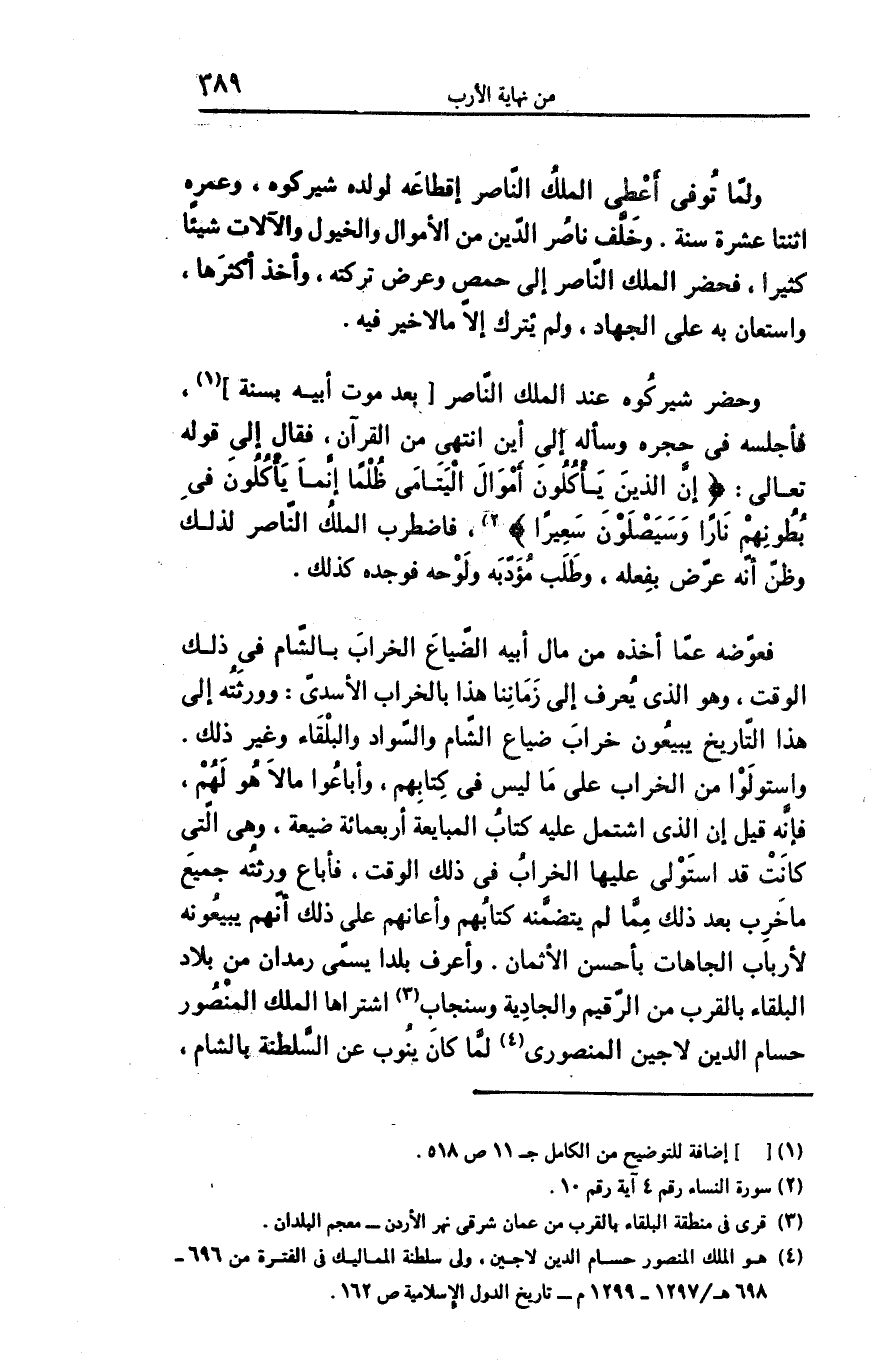 وحضر شيركوه عند الملك النّاصر [بعد موت أبيه بسنة] «1» ، فأجلسه فى حجره وسأله إلى أين انتهى من القرآن، فقال إلى قوله تعالى: إِنَّ الَّذِينَ يَأْكُلُونَ أَمْوالَ الْيَتامى ظُلْماً إِنَّما يَأْكُلُونَ فِي بُطُونِهِمْ ناراً وَسَيَصْلَوْنَ سَعِيراً