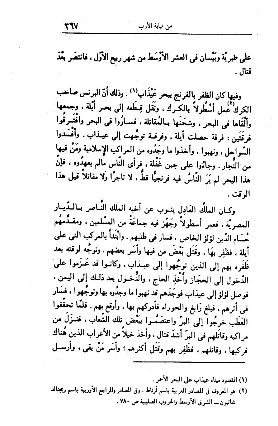 وفيها كان الظفر بالفرنج ببحر عيذاب «1» . وذلك أنّ البرنس صاحب الكرك «2» عمل أسطولا بالكرك، ونقل قطعه إلى بحر أيلة، وجمعها وألقاها فى البحر، وشحنها بالمقاتلة، فساروا فى البحر وافترقوا فرقتين: فرقة حصلت أيلة، وفرقة توجّهت إلى عيذاب. وأفسدوا السّواحل، ونهبوا، وأخذوا ما وجدوه من المراكب الإسلامية ومن فيها من التّجار. وجاءوا على حين غفلة، فرأى النّاس ما لم يعهدوه، فإنّ هذا البحر لم ير النّاس فيه فرنجيّا قطّ، لا تاجرا ولا مقاتلا قبل هذا الوقت.