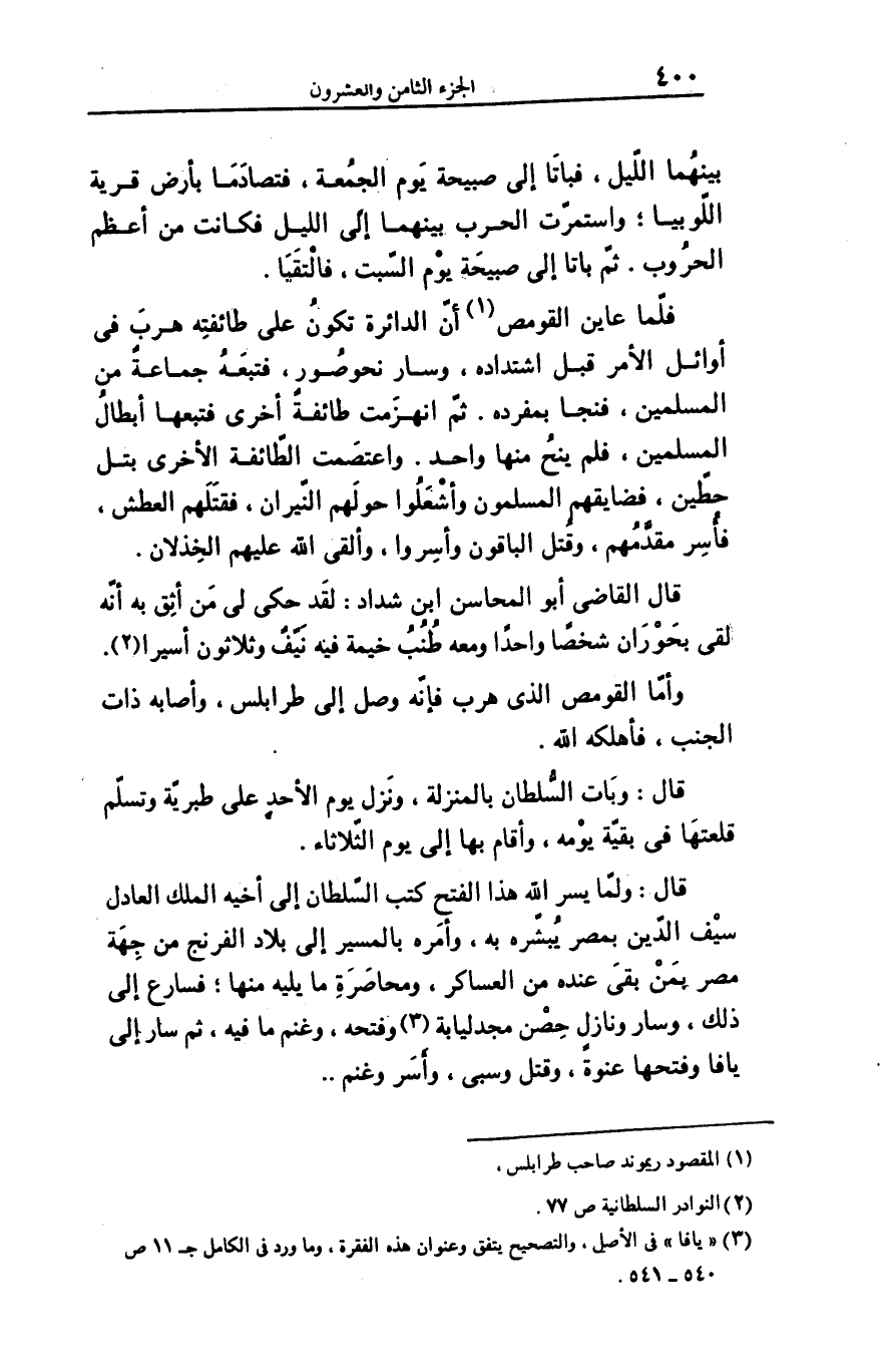 وأمّا القومص الذى هرب فإنّه وصل إلى طرابلس، وأصابه ذات الجنب، فأهلكه الله.