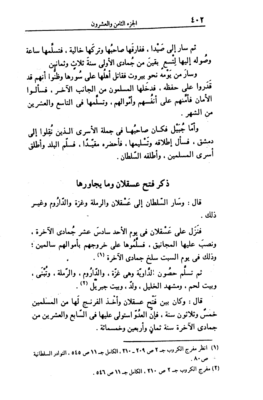 قال: وكان بين فتح عسقلان وأخذ الفرنج لها من المسلمين خمس وثلاثون سنة، فإنّ العدوّ استولى عليها فى السّابع والعشرين من جمادى الآخرة سنة ثمان وأربعين وخمسمائة.