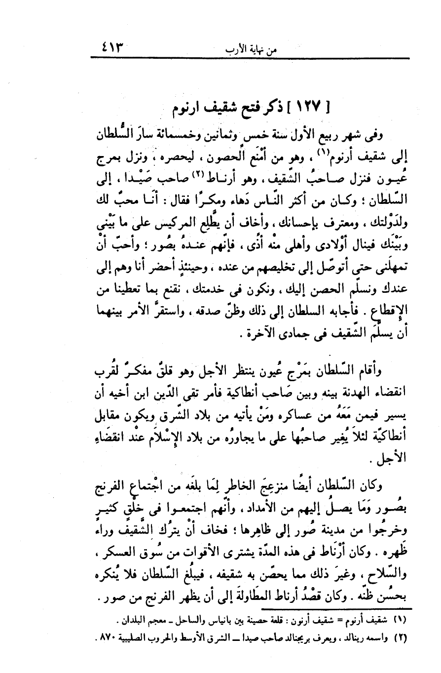 وفى شهر ربيع الأول سنة خمس وثمانين وخمسمائة سار السّلطان إلى شقيف أرنوم «1» ، وهو من أمنع الحصون، ليحصره، ونزل بمرج عيون فنزل صاحب الشّقيف، وهو أرناط «2» صاحب صيدا، إلى السّلطان؛ وكان من أكثر النّاس دهاء ومكرا فقال: أنا محب لك ولدولتك، ومعترف بإحسانك، وأخاف أن يطّلع المركيس على ما بينى وبينك فينال أولادى وأهلى منه أذى، فإنّهم عنده بصور؛ وأحبّ أن تمهلنى حتى أتوصّل إلى تخليصهم من عنده، وحينئذ أحضر أنا وهم إلى عندك ونسلّم الحصن إليك، ونكون فى خدمتك، نقنع بما تعطينا من الإقطاع. فأجابه السلطان إلى ذلك وظنّ صدقه، واستقرّ الأمر بينهما أن يسلّم الشّقيف فى جمادى الآخرة.