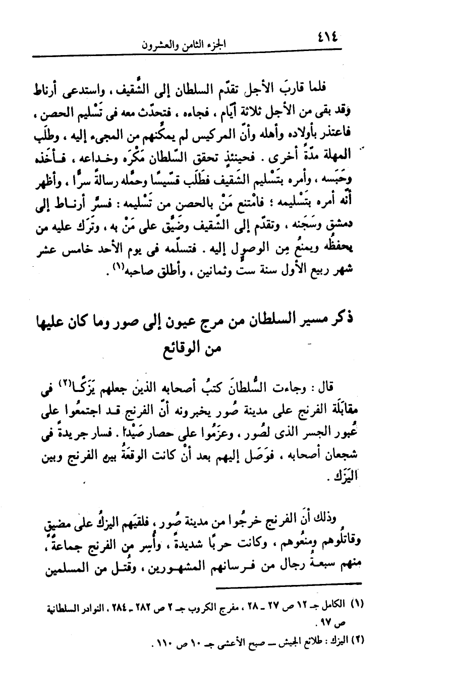 قال: وجاءت السّلطان كتب أصحابه الذين جعلهم يزكا «2» فى مقابلة الفرنج على مدينة صور يخبرونه أنّ الفرنج قد اجتمعوا على عبور الجسر الذى لصور، وعزموا على حصار صيدا. فسار جريدة فى شجعان أصحابه، فوصل إليهم بعد أن كانت الوقعة بين الفرنج وبين اليزك.