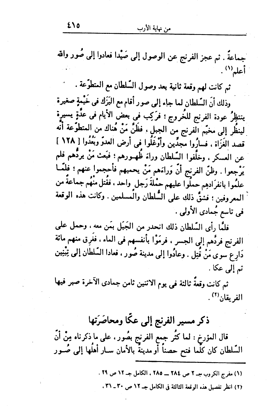 وذلك أن السّلطان لما جاء إلى صور أقام مع اليزك فى خيمة صغيرة ينتظر عودة الفرنج للخروج؛ فركب فى بعض الأيام فى عدّة يسيرة لينظر إلى مخيّم الفرنج من الجبل، فظنّ من هناك من المتطوّعة أنّه قصد الغزاة، فساروا مجدّين وأوغلوا فى أرض العدوّ وبعدوا [128] عن العسكر، وخلّفوا السّلطان وراء ظهورهم؛ فبعث من يردّهم فلم يرجعوا. وظنّ الفرنج أنّ وراءهم من يحميهم فأحجموا عنهم؛ فلمّا علموا بانفرادهم حملوا عليهم حملة رجل واحد، فقتل منهم جماعة من المعروفين؛ فشقّ ذلك على السّلطان والمسلمين. وكانت هذه الوقعة فى تاسع جمادى الأولى.