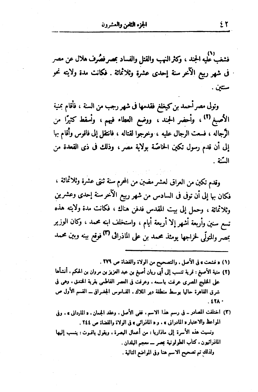 وتولى مصر أحمد بن كيغلغ فقدمها فى شهر رجب من السنة، فأقام بمنية الأصبغ «2» ، وأحضر الجند، ووضع العطاء فيهم، وأسقط كثيرا من الرّجاله، فسعت الرجال عليه، وخرجوا لقتاله، فانتقل إلى فاقوس وأقام بها إلى أن قدم رسول تكين الخاصّة بولاية مصر، وذلك فى ذى القعدة من السّنة.