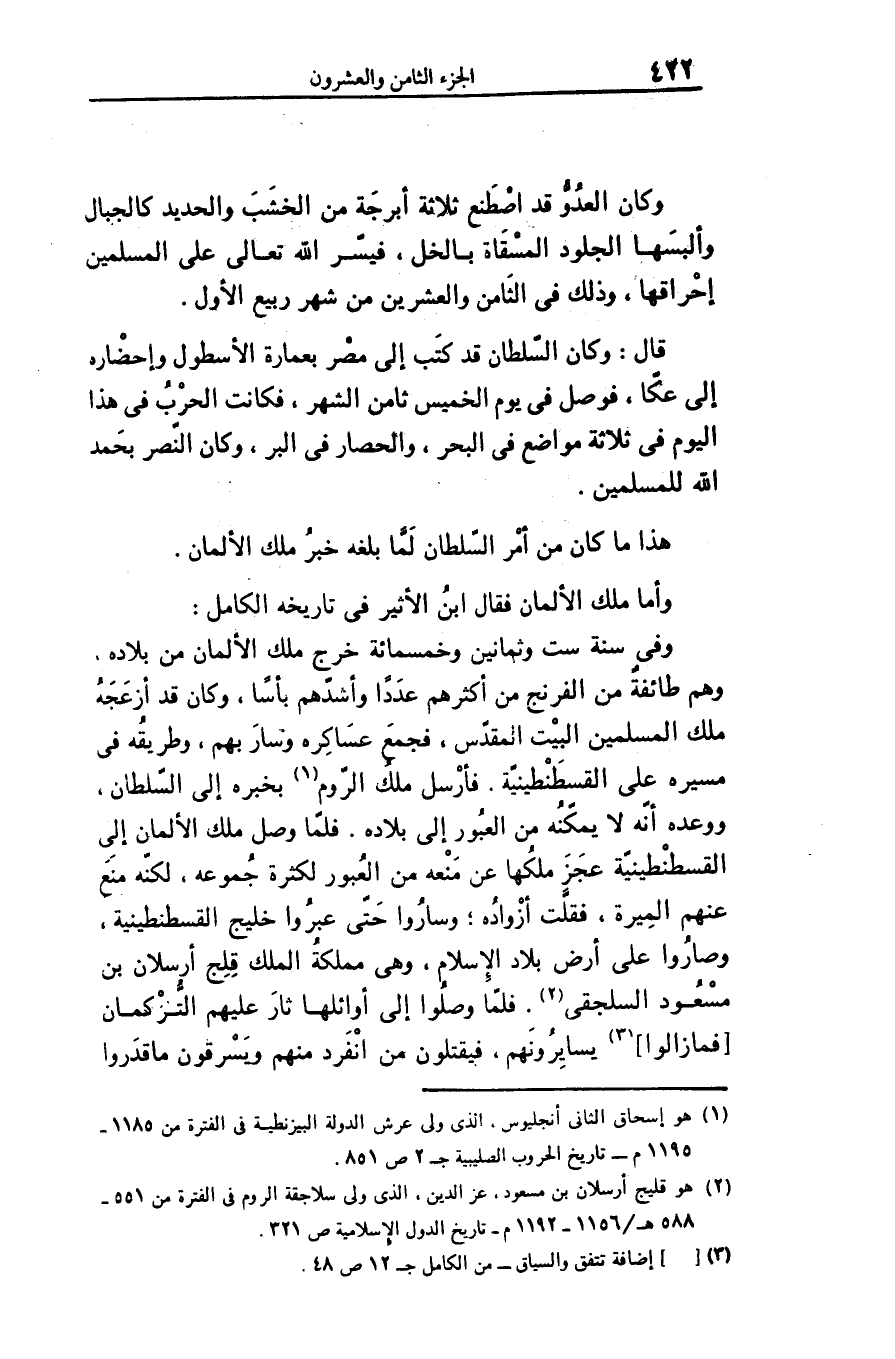 وفى سنة ست وثمانين وخمسمائة خرج ملك الألمان من بلاده، وهم طائفة من الفرنج من أكثرهم عددا وأشدّهم بأسا، وكان قد أزعجه ملك المسلمين البيت المقدّس، فجمع عساكره وسار بهم، وطريقه فى مسيره على القسطنطينيّة. فأرسل ملك الرّوم «1» بخبره إلى السّلطان، ووعده أنّه لا يمكّنه من العبور إلى بلاده. فلمّا وصل ملك الألمان إلى القسطنطينيّة عجز ملكها عن منعه من العبور لكثرة جموعه، لكنّه منع عنهم الميرة، فقلّت أزواده؛ وساروا حتّى عبروا خليج القسطنطينية، وصاروا على أرض بلاد الإسلام، وهى مملكة الملك قلج أرسلان بن مسعود السلجقى «2» . فلمّا وصلوا إلى أوائلها ثار عليهم التّركمان [فما زالوا] «3» يسايرونهم، فيقتلون من انفرد منهم ويسرقون ما قدروا