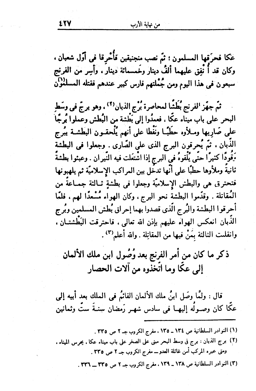 قال: ولمّا وصل ابن ملك الألمان القائم فى الملك بعد أبيه إلى عكّا كان وصوله إليها فى سادس شهر رمضان سنة ستّ وثمانين