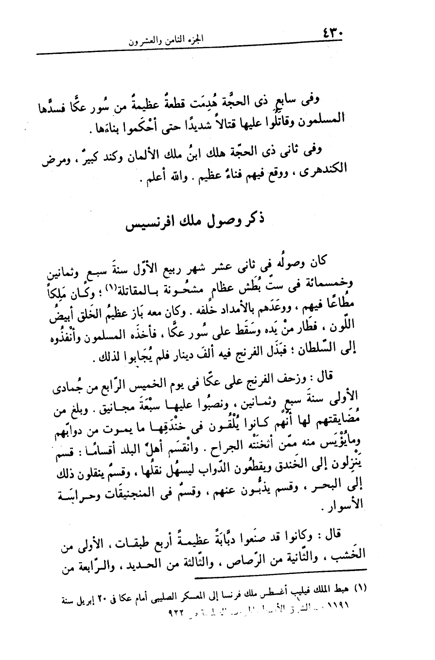 كان وصوله فى ثانى عشر شهر ربيع الأوّل سنة سبع وثمانين وخمسمائة فى ستّ بطش عظام مشحونة بالمقاتلة «1» ؛ وكان ملكا مطاعا فيهم، ووعدهم بالأمداد خلفه. وكان معه باز عظيم الخلق أبيض اللّون، فطار من يده وسقط على سور عكّا، فأخذه المسلمون وأنفذوه إلى السّلطان؛ فبذل الفرنج فيه ألف دينار فلم يجابوا لذلك.