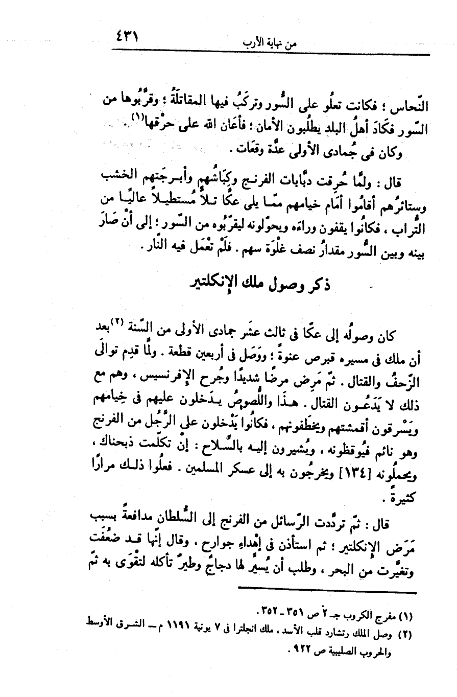 كان وصوله إلى عكّا فى ثالث عشر جمادى الأولى من السّنة «2» بعد أن ملك فى مسيره قبرص عنوة؛ ووصل فى أربعين قطعة. ولمّا قدم توالى الزّحف والقتال. ثمّ مرض مرضا شديدا وجرح الإفرنسيس، وهم مع ذلك لا يدعون القتال. هذا واللّصوص يدخلون عليهم فى خيامهم ويسرقون أقمشتهم ويخطفونهم، فكانوا يدخلون على الرّجل من الفرنج وهو نائم فيوقظونه، ويشيرون إليه بالسّلاح: إن تكلّمت ذبحناك، ويحملونه [134] ويخرجون به إلى عسكر المسلمين. فعلوا ذلك مرارا كثيرة.