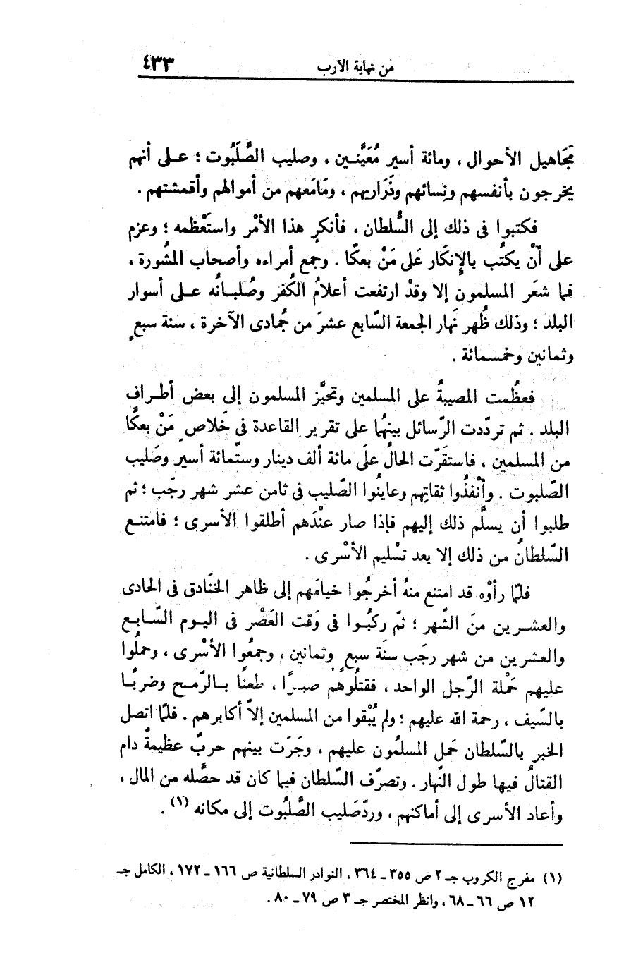 فلمّا رأوه قد امتنع منه أخرجوا خيامهم إلى ظاهر الخنادق فى الحادى والعشرين من الشّهر؛ ثمّ ركبوا فى وقت العصر فى اليوم السّابع والعشرين من شهر رجب سنة سبع وثمانين، وجمعوا الأسرى، وحملوا عليهم حملة الرّجل الواحد، فقتلوهم صبرا، طعنا بالرّمح وضربا بالسّيف، رحمة الله عليهم؛ ولم يبقوا من المسلمين إلّا أكابرهم. فلمّا اتصل الخبر بالسّلطان حمل المسلمون عليهم، وجرت بينهم حرب عظيمة دام القتال فيها طول النّهار. وتصرّف السّلطان فيما كان قد حصّله من المال، وأعاد الأسرى إلى أماكنهم، وردّ صليب الصّلبوت إلى مكانه «1» .
