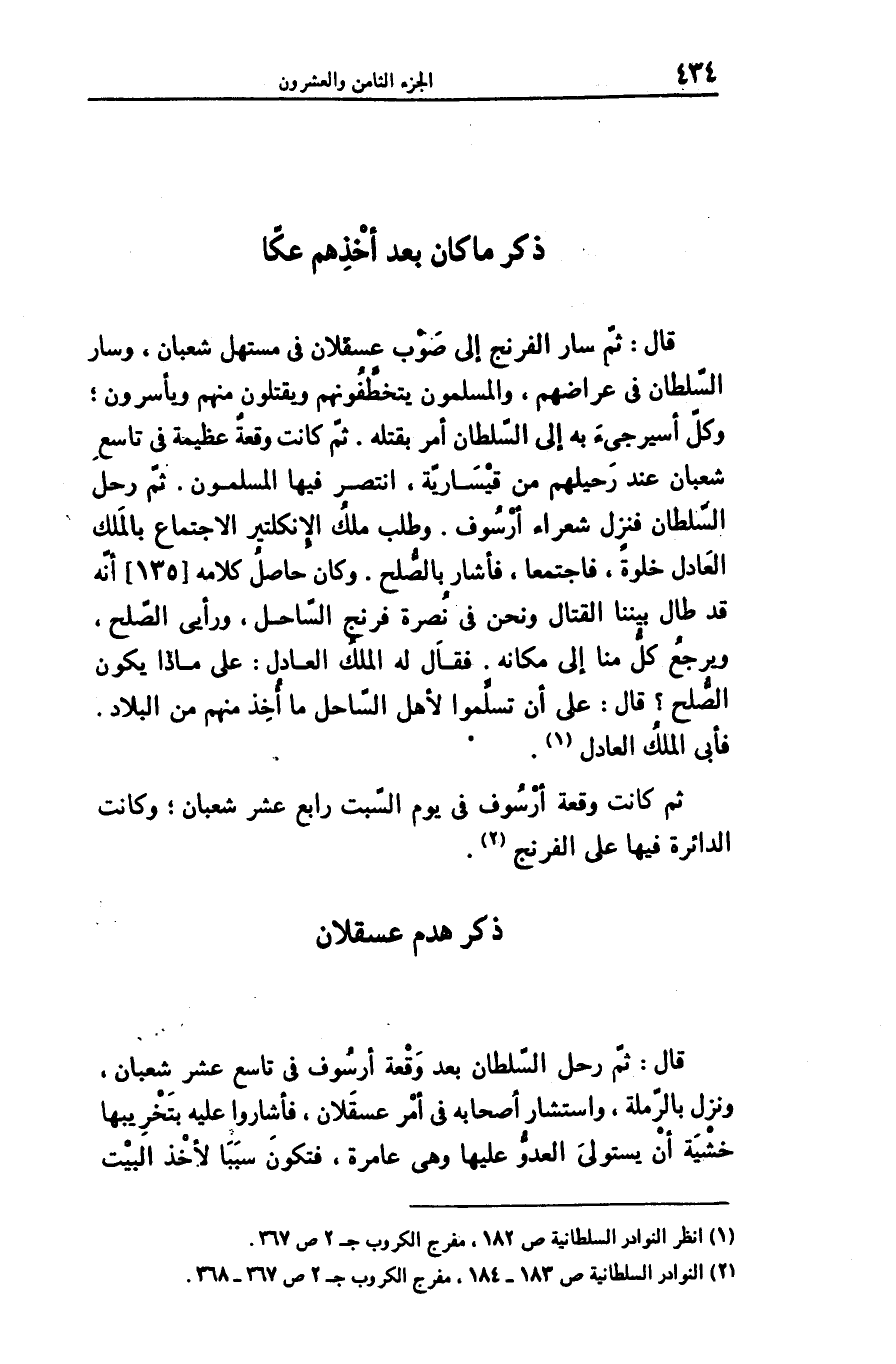 قال: ثمّ سار الفرنج إلى صوب عسقلان فى مستهل شعبان، وسار السّلطان فى عراضهم، والمسلمون يتخطّفونهم ويقتلون منهم ويأسرون؛ وكلّ أسير جىء به إلى السّلطان أمر بقتله. ثمّ كانت وقعة عظيمة فى تاسع شعبان عند رحيلهم من قيساريّة، انتصر فيها المسلمون. ثمّ رحل السّلطان فنزل شعراء أرسوف. وطلب ملك الإنكلتير الاجتماع بالملك العادل خلوة، فاجتمعا، فأشار بالصّلح. وكان حاصل كلامه [135] أنّه قد طال بيننا القتال ونحن فى نصرة فرنج السّاحل، ورأيى الصّلح، ويرجع كلّ منا إلى مكانه. فقال له الملك العادل: على ماذا يكون الصّلح؟ قال: على أن تسلّموا لأهل السّاحل ما أخذ منهم من البلاد.