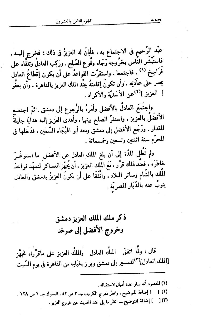 عبد الرّحيم فى الاجتماع به، فأذن له العزيز فى ذلك؛ فخرج إليه، فاستبشر النّاس بخروجه رجاء وقوع الصّلح. وركب العادل وتلقّاه على فراسخ «1» ، فاجتمعا، واستقرّت القواعد على أن يكون إقطاع العادل بمصر على عادته، وأن تكون إقامته عند الملك العزيز بالقاهرة، وأن يعفو [العزيز] «2» عن الأسديّة والأكراد.