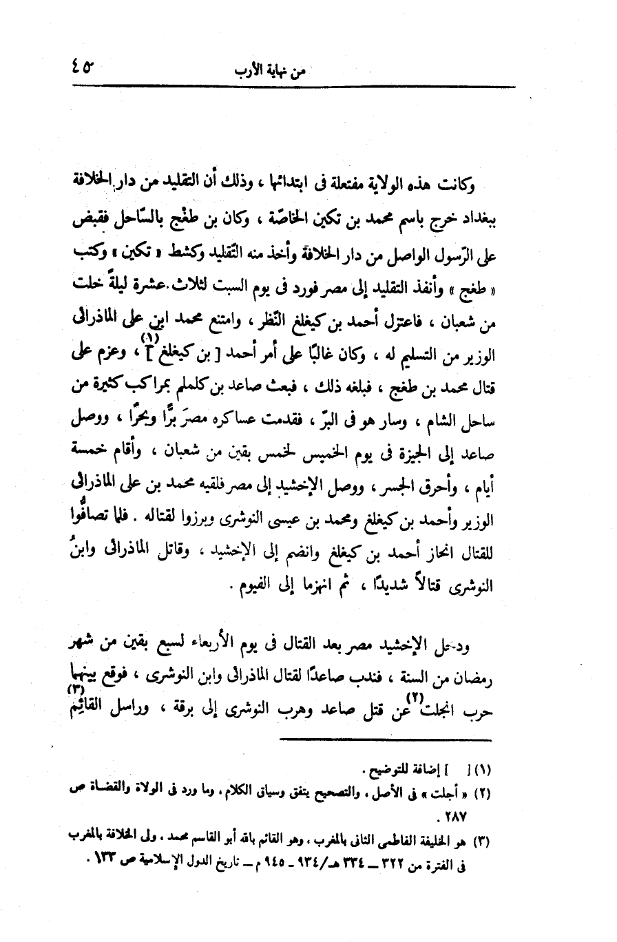وكانت هذه الولاية مفتعلة فى ابتدائها، وذلك أن التقليد من دار الخلافة ببغداد خرج باسم محمد بن تكين الخاصّة، وكان بن طغج بالسّاحل فقبض على الرّسول الواصل من دار الخلافة وأخذ منه التّقليد وكشط «تكين» وكتب «طغج» وأنفذ التقليد إلى مصر فورد فى يوم السبت لثلاث عشرة ليلة خلت من شعبان، فاعتزل أحمد بن كيغلغ النّظر، وامتنع محمد ابن على الماذرائى الوزير من التسليم له، وكان غالبا على أمر أحمد [بن كيغلغ] «1» ، وعزم على قتال محمد بن طغج، فبلغه ذلك، فبعث صاعد بن كلملم بمراكب كثيرة من ساحل الشام، وسار هو فى البرّ، فقدمت عساكره مصر برّا وبحرا، ووصل صاعد إلى الجيزة فى يوم الخميس لخمس بقين من شعبان، وأقام خمسة أيام، وأحرق الجسر، ووصل الإخشيد إلى مصر فلقيه محمد بن على الماذرائى الوزير وأحمد بن كيغلغ ومحمد بن عيسى النوشرى وبرزوا لقتاله. فلما تصافّوا للقتال انحاز أحمد بن كيغلغ وانضم إلى الإخشيد، وقاتل الماذرائى وابن النوشرى قتالا شديدا، ثم انهزما إلى الفيوم.