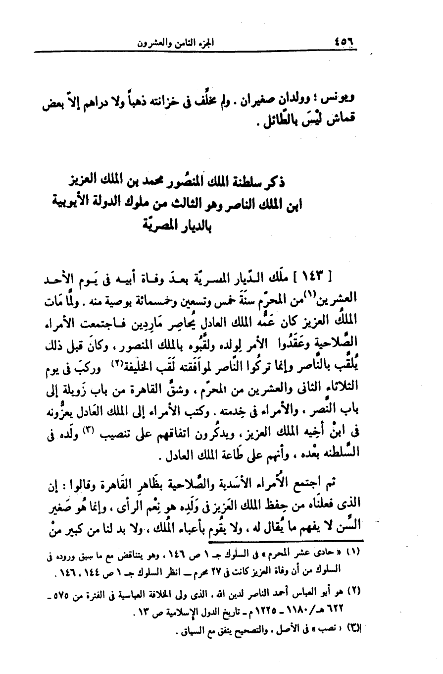 [143] ملك الدّيار المصريّة بعد وفاة أبيه فى يوم الأحد العشرين «1» من المحرّم سنة خمس وتسعين وخمسمائة بوصية منه. ولمّا مات الملك العزيز كان عمّه الملك العادل يحاصر ماردين فاجتمعت الأمراء الصّلاحية وعقدوا الأمر لولده ولقّبوه بالملك المنصور، وكان قبل ذلك يلقّب بالنّاصر وإنما تركوا النّاصر لموافقته لقب الخليفة «2» وركب فى يوم الثلاثاء الثانى والعشرين من المحرّم، وشقّ القاهرة من باب زويلة إلى باب النّصر، والأمراء فى خدمته. وكتب الأمراء إلى الملك العادل يعزّونه فى ابن أخيه الملك العزيز، ويدكرون اتفاقهم على تنصيب «3» ولده فى السّلطنه بعده، وأنهم على طاعة الملك العادل.