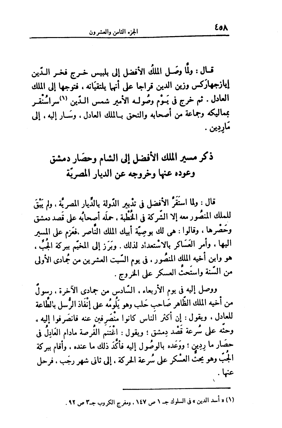 قال: ولما استقرّ الأفضل فى تدبير الدّولة بالدّيار المصريّة، ولم يبق للملك المنصور معه إلا الشّركة فى الخطبة، حمله أصحابه على قصد دمشق وحصرها، وقالوا: هى لك بوصيّة أبيك الملك النّاصر فعزم على المسير اليها، وأمر العساكر بالاستعداد لذلك. وبرز إلى المخيّم ببركة الجبّ، هو وابن أخيه الملك المنصور، فى يوم السّبت العشرين من جمادى الأولى من السّنة واستحثّ العسكر على الخروج.