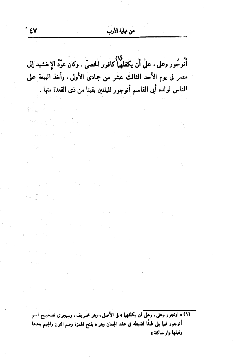 أنوجور وعلى، على أن يكفلهما «1» كافور الخصىّ. وكان عود الإخشيد إلى مصر فى يوم الأحد الثالث عشر من جمادى الأولى، وأخذ البيعة على الناس لولده أبى القاسم أنوجور لليلتين بقيتا من ذى القعدة منها.