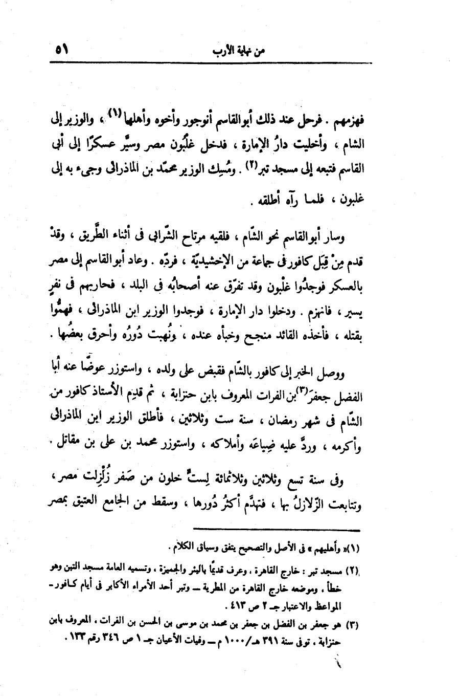 فهزمهم. فرحل عند ذلك أبو القاسم أنوجور وأخوه وأهلهما «1» ، والوزير إلى الشام، وأخليت دار الإمارة، فدخل غلبون مصر وسيّر عسكرا إلى أبى القاسم فتبعه إلى مسجد تبر «2» . ومسك الوزير محمّد بن الماذرائى وجىء به إلى غلبون، فلما رآه أطلقه.
