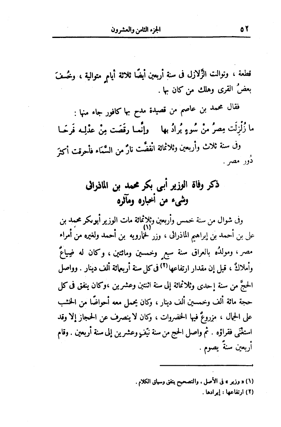 وفى شوال من سنة خمس وأربعين وثلاثمائة مات الوزير أبو بكر محمد بن على بن أحمد بن إبراهيم الماذرائى، وزر «1» الخمارويه بن أحمد ولغيره من أمراء مصر، ومولده بالعراق سنة سبع وخمسين ومائتين، وكان له ضياع وأملاك، قيل إن مقدار ارتفاعها «2» فى كل سنة أربعمائة ألف دينار. وواصل الحجّ من سنة إحدى وثلاثمائة إلى سنة اثنتين وعشرين، وكان ينفق فى كل حجة مائة ألف وخمسين ألف دينار، وكان يحمل معه أحواضا من الخشب على الجمال، مزروع فيها الخضروات، وكان لا ينصرف عن الحجاز إلا وقد استغنى فقراؤه. ثم واصل الحج من سنة نيّف وعشرين إلى سنة أربعين. وقام أربعين سنة يصوم.
