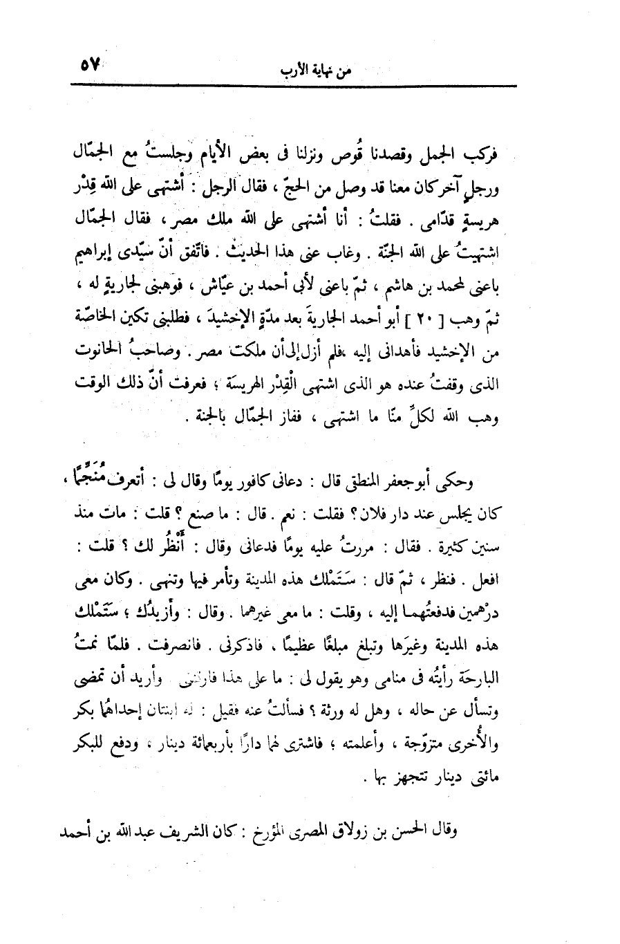 فركب الجمل وقصدنا قوص ونزلنا فى بعض الأيام وجلست مع الجمّال ورجل آخر كان معنا قد وصل من الحجّ، فقال الرجل: أشتهى على الله قدر هريسة قدّامى. فقلت: أنا أشتهى على الله ملك مصر، فقال الجمّال اشتهيت على الله الجنّة. وغاب عنى هذا الحديث. فاتّفق أنّ سيّدى إبراهيم باعنى لمحمد بن هاشم، ثمّ باعنى لأبى أحمد بن عيّاش، فوهبنى لجارية له، ثمّ وهب [20] أبو أحمد الجارية بعد مدّة الإخشيد، فطلبنى تكين الخاصّة من الإخشيد فأهدانى إليه، فلم أزل إلى أن ملكت مصر. وصاحب الحانوت الذى وقفت عنده هو الذى اشتهى القدر الهريسة؛ فعرفت أنّ ذلك الوقت وهب الله لكلّ منّا ما اشتهى، ففاز الجمّال بالجنة.