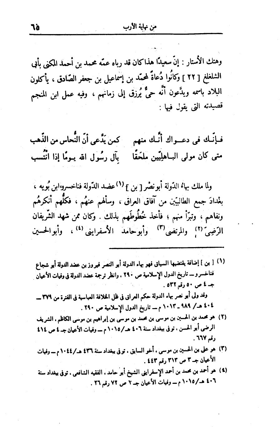 ولما ملك بهاء الدّولة أبو نصر [بن] «1» عضد الدّولة فناخسرو، ابن بويه، بغداد جمع الطالبيّين من آفاق العراق، وسألهم عنهم، فكلّهم أنكرهم ونفاهم، وتبرّأ منهم؛ فأخذ خطوطهم بذلك. وكان ممن شهد الشّريفان الرّضىّ «2» والمرتضى «3» وأبو حامد الأسفراينى «4» ، وأبو الحسين
