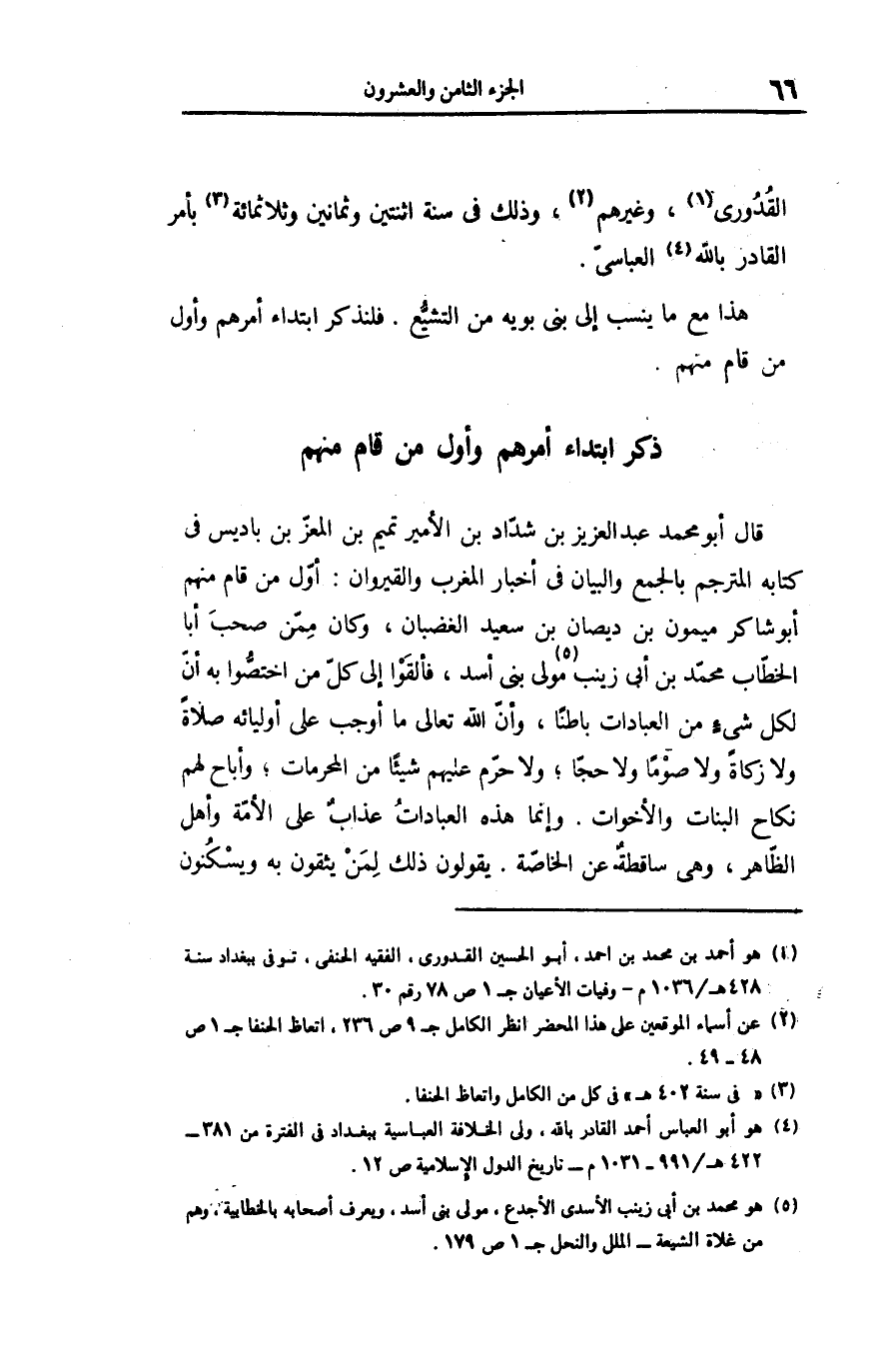 القدورى «1» ، وغيرهم «2» ، وذلك فى سنة اثنتين وثمانين وثلاثمائة «3» بأمر القادر بالله «4» العباسىّ.