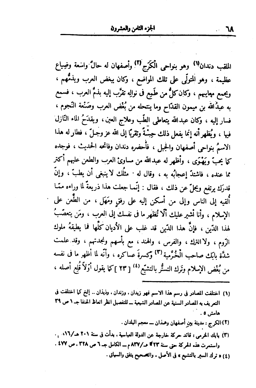 الملقب دندان «1» وهو بنواحى الكرج «2» وأصفهان له حال واسعة وضياع عظيمة، وهو المتولّى على تلك المواضع، وكان يبغض العرب ويذمّهم، ويجمع معايبهم، وكان كلّ من طمع فى نواله تقرّب إليه بذمّ العرب، فسمع به عبد الله بن ميمون القدّاح وما ينتحله من بغض العرب وصنعة النّجوم، فسار إليه، وكان عبد الله يتعاطى الطّب وعلاج العين، ويقدح الماء النّازل فيها، ويظهر أنه إنما يفعل ذلك حبسة وتقربا إلى الله عز وجلّ، فطار له هذا الاسم بنواحى أصفهان والجبل، فأحضره دندان وفاتحه الحديث، فوجده كما يحبّ ويهوى، وأظهر له عبد الله من مساوئ العرب والطعن عليهم أكتر مما عنده، فاشتدّ إعجابه به، وقال له. مثلك لا ينبغى أن يطبّ، وإنّ قدرك يرتفع ويجلّ عن ذلك، فقال: إنّما جعلت هذا ذريعة لما وراءه ممّا ألقيه إلى الناس وإلى من أسكن إليه على رفق ومهل، من الطّعن على الإسلام، وأنا أشير عليك ألّا تظهر ما فى نفسك إلى العرب، ومن يتعصّب لهذا الدّين، فإنّ هذا الدّين قد غلب على الأديان كلّها فما يطيقه ملوك الرّوم، ولا الترك، والفرس، والهند، مع بأسهم ونجدتهم، وقد علمت شدّة بابك صاحب الخرّمية «3» وكسرة عساكره، وأنّه لما أظهر ما فى نفسه من بغض الإسلام وترك التستّر بالتشيّع «4» [23] كما يقول أوّلا قلع أصله،