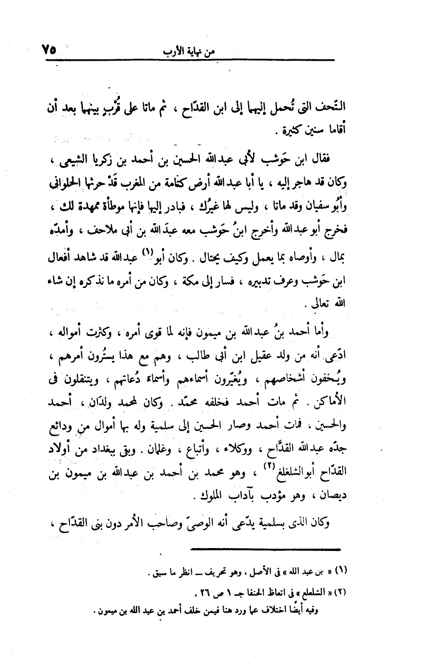 وأما أحمد بن عبد الله بن ميمون فإنه لما قوى أمره، وكثرت أمواله، ادّعى أنه من ولد عقيل ابن أبى طالب، وهم مع هذا يسترون أمرهم، ويخفون أشخاصهم، ويغيّرون أسماءهم وأسماء دعاتهم، ويتنقلون فى الأماكن. ثم مات أحمد وصار الحسين إلى سلمية وله بها أموال من ودائع جدّه عبد الله القدّاح، ووكلاء، وأتباع، وغلمان. وبقى ببغداد من أولاد القدّاح أبو الشلغلغ «2» ، وهو محمد بن أحمد بن عبد الله بن ميمون بن ديصان، وهو مؤدب بآداب الملوك.