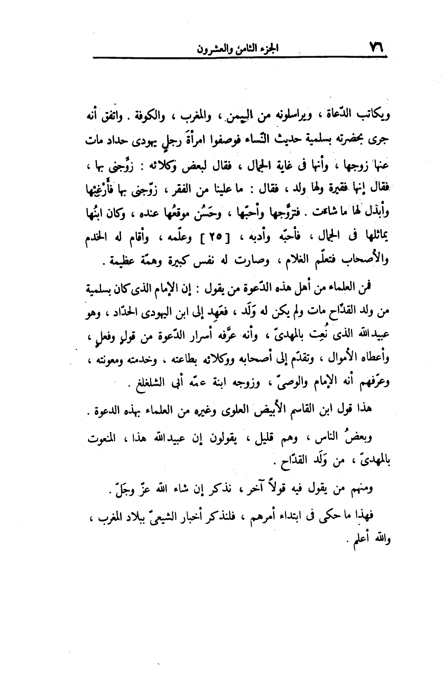 فمن العلماء من أهل هذه الدّعوة من يقول: إن الإمام الذى كان بسلمية من ولد القدّاح مات ولم يكن له ولد، فعهد إلى ابن اليهودى الحدّاد، وهو عبيد الله الذى نعت بالمهدىّ، وأنه عرّفه أسرار الدّعوة من قول وفعل، وأعطاه الأموال، وتقدّم إلى أصحابه ووكلائه بطاعته، وخدمته ومعونته، وعرّفهم أنه الإمام والوصىّ، وزوجه ابنة عمّه أبى الشلغلغ.