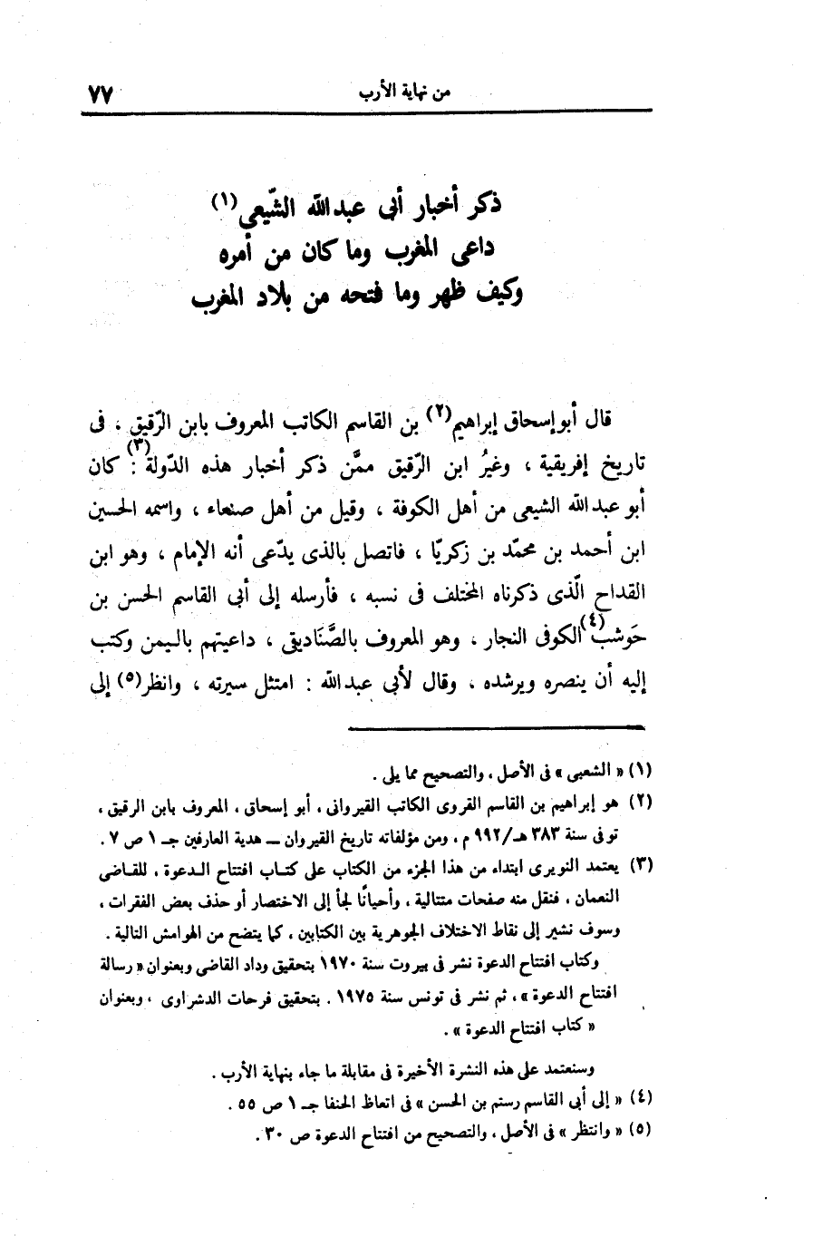 قال أبو إسحاق إبراهيم «2» بن القاسم الكاتب المعروف بابن الرّقيق، فى تاريخ إفريقية، وغير ابن الرّقيق ممّن ذكر أخبار هذه الدّولة «3» : كان أبو عبد الله الشيعى من أهل الكوفة، وقيل من أهل صنعاء، واسمه الحسين ابن أحمد بن محمّد بن زكريّا، فاتصل بالذى يدّعى أنه الإمام، وهو ابن القداح الّذى ذكرناه المختلف فى نسبه، فأرسله إلى أبى القاسم الحسن بن حوشب «4» الكوفى النجار، وهو المعروف بالصّناديقى، داعيتهم باليمن وكتب إليه أن ينصره ويرشده، وقال لأبى عبد الله: امتثل سيرته، وانظر «5» إلى