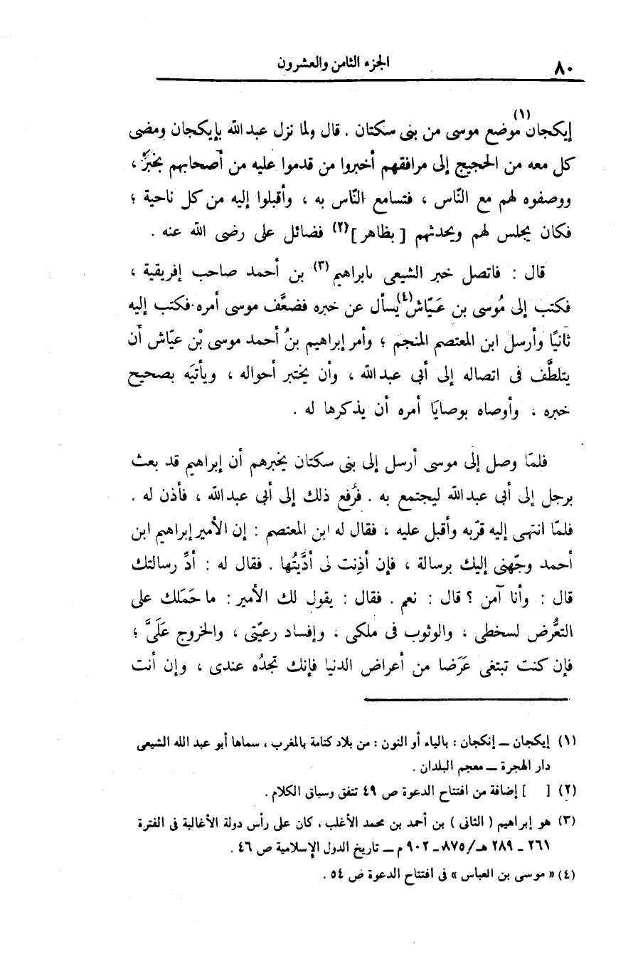 قال: فاتصل خبر الشيعى بابراهيم «3» بن أحمد صاحب إفريقية، فكتب إلى موسى بن عيّاش «4» يسأل عن خبره فضعّف موسى أمره فكتب إليه ثانيا وأرسل ابن المعتصم المنجم؛ وأمر إبراهيم بن أحمد موسى بن عيّاش أن يتلطّف فى اتصاله إلى أبى عبد الله، وأن يختبر أحواله، ويأتيه بصحيح خبره، وأوصاه بوصايا أمره أن يذكرها له.