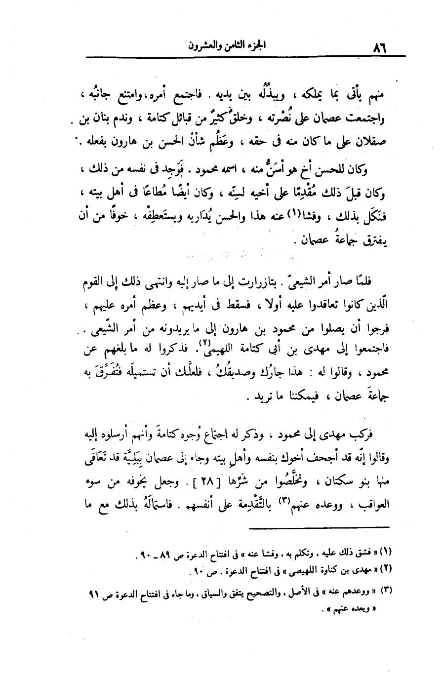 فركب مهدى إلى محمود، وذكر له اجتماع وجوه كتامة وأنهم أرسلوه إليه وقالوا إنّه قد أجحف أخوك بنفسه وأهل بيته وجاء إلى عصمان ببليّة قد تعافى منها بنو سكتان، وتخلّصوا من شرّها [28] . وجعل يخوفه من سوء العواقب، ووعده عنهم «3» بالتّقدمة على أنفسهم. فاستماله بذلك مع ما