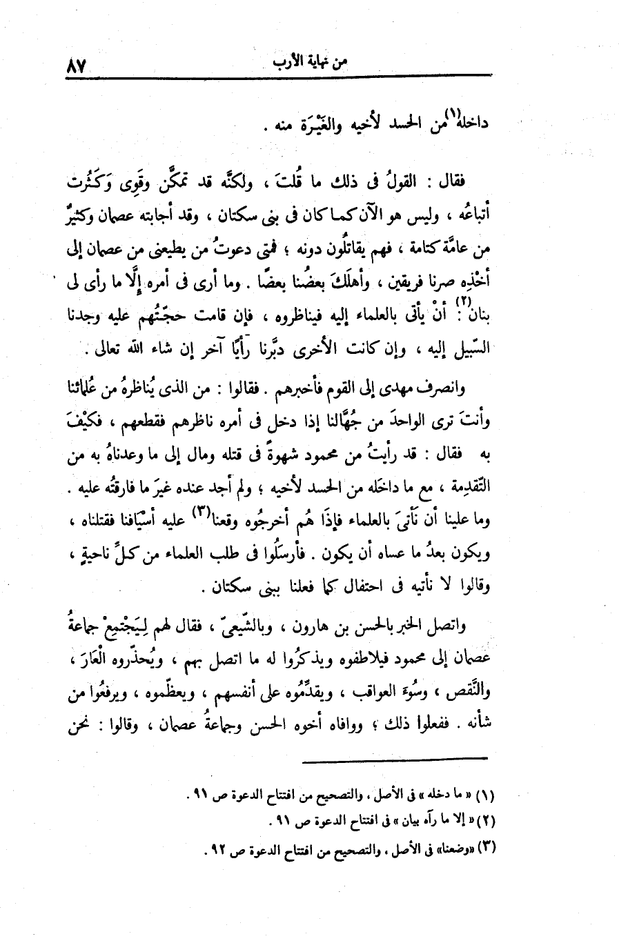 وما علينا أن نأتى بالعلماء فإذا هم أخرجوه وقعنا «3» عليه أسيافنا فقتلناه، ويكون بعد ما عساه أن يكون. فأرسلوا فى طلب العلماء من كلّ ناحية، وقالوا لا نأتيه فى احتفال كما فعلنا ببنى سكتان.