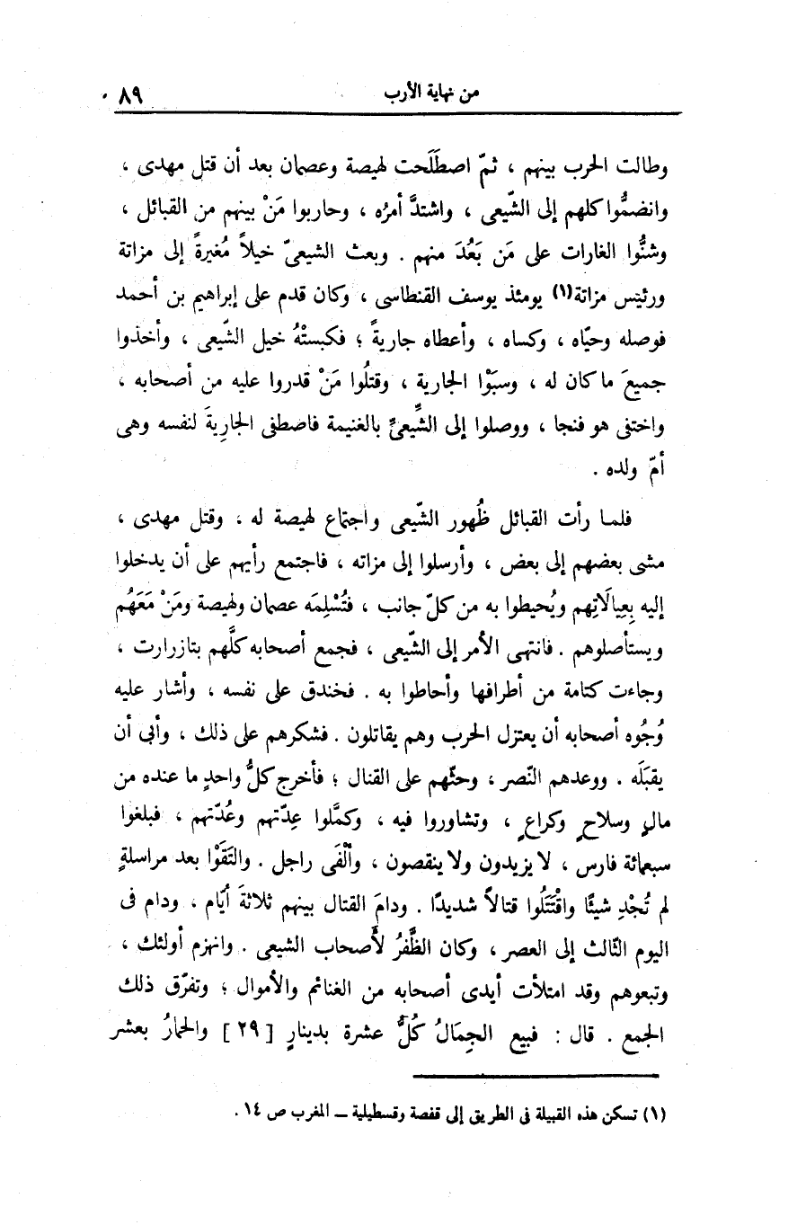 وطالت الحرب بينهم، ثمّ اصطلحت لهيصة وعصمان بعد أن قتل مهدى، وانضمّوا كلهم إلى الشّيعى، واشتدّ أمره، وحاربوا من بينهم من القبائل، وشنّوا الغارات على من بعد منهم. وبعث الشيعىّ خيلا مغيرة إلى مزاتة ورئيس مزاتة «1» يومئذ يوسف القنطاسى، وكان قدم على إبراهيم بن أحمد فوصله وحيّاه، وكساه، وأعطاه جارية؛ فكبسته خيل الشّيعى، وأخذوا جميع ما كان له، وسبوا الجارية، وقتلوا من قدروا عليه من أصحابه، واختفى هو فنجا، ووصلوا إلى الشّيعىّ بالغنيمة فاصطفى الجارية لنفسه وهى أمّ ولده.