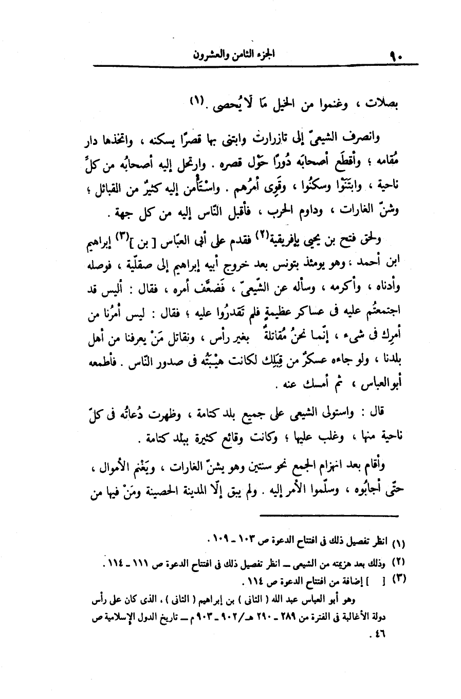 ولحق فتح بن يحيى بإفريقية «2» فقدم على أبى العبّاس [بن] «3» إبراهيم ابن أحمد، وهو يومئذ بتونس بعد خروج أبيه إبراهيم إلى صقلّية، فوصله وأدناه، وأكرمه، وسأله عن الشّيعىّ، فضعّف أمره، فقال: أليس قد اجتمعتم عليه فى عساكر عظيمة فلم تقدروا عليه؛ فقال: ليس أمرنا من أمرك فى شىء، إنّما نحن مقاتلة بغير رأس، ونقاتل من يعرفنا من أهل بلدنا، ولو جاءه عسكر من قبلك لكانت هيبته فى صدور النّاس. فأطمعه أبو العباس، ثم أمسك عنه.