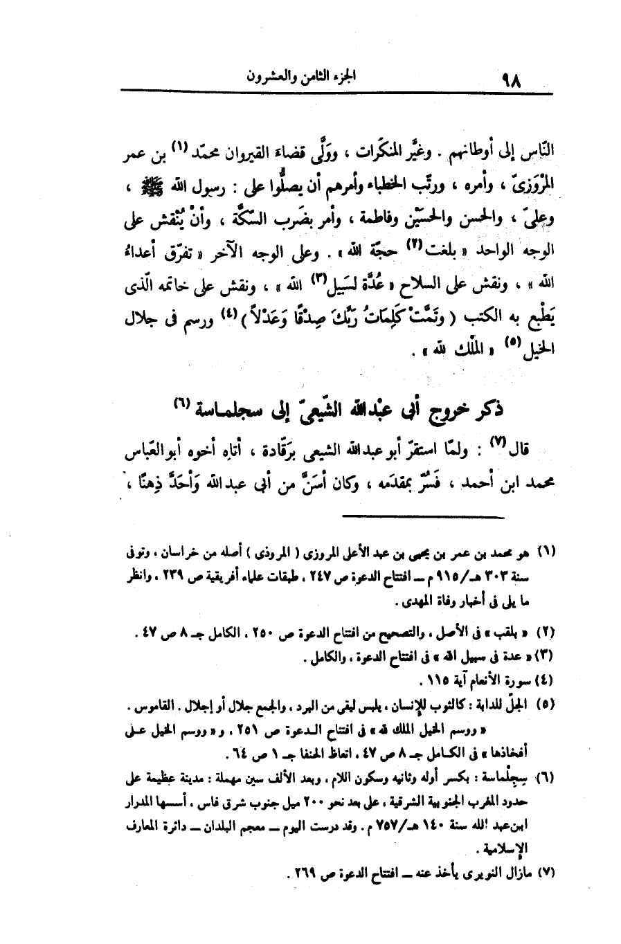 النّاس إلى أوطانهم. وغيّر المنكرات، وولّى قضاء القيروان محمّد «1» بن عمر المروزىّ، وأمره، ورتّب الخطباء وأمرهم أن يصلّوا على: رسول الله صلى الله عليه وسلم، وعلىّ، والحسن والحسين وفاطمة، وأمر بضرب السّكّة، وأن ينقش على الوجه الواحد «بلغت «2» حجّة الله» . وعلى الوجه الآخر «تفرّق أعداء الله» ، ونقش على السلاح «عدّة لسبيل «3» الله» ، ونقش على خاتمه الّذى يطبع به الكتب (وتمّت كلمات ربّك صدقا وعدلا) «4» ورسم فى جلال الخيل «5» «الملك لله» .