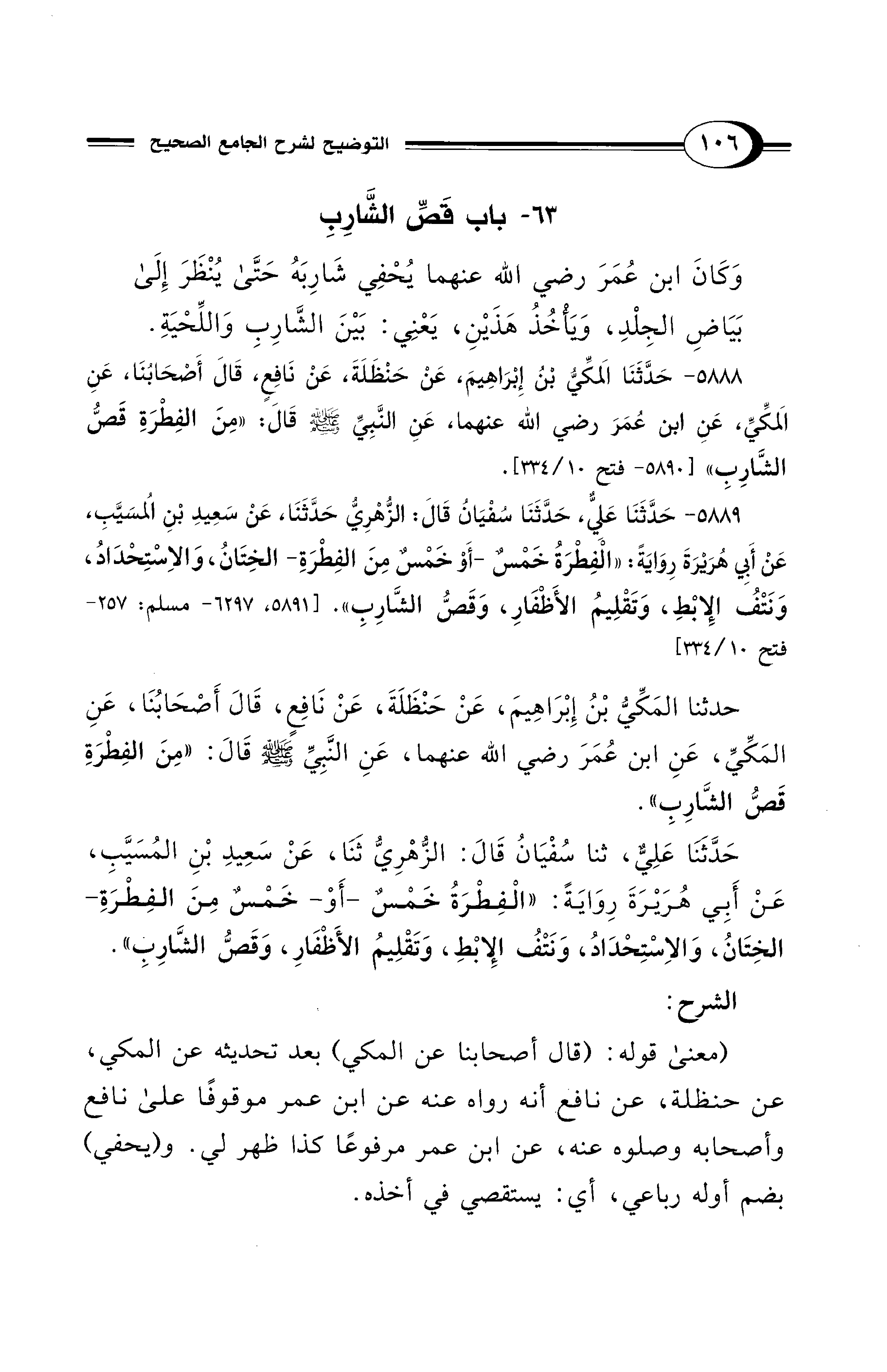 5888 - حَدَّثَنَا الْمَكِّيُّ بْنُ إِبْرَاهِيمَ، عَنْ حَنْظَلَةَ، عَنْ نَافِعٍ، قَالَ أَصْحَابُنَا، عَنِ الْمَكِّيِّ، عَنِ ابْنِ عُمَرَ - رضي الله عنهما -، عَنِ النَّبِيِّ - صلى الله عليه وسلم - قَالَ: «مِنَ الْفِطْرَةِ قَصُّ الشَّارِبِ». [5890 - فتح 10/ 334].