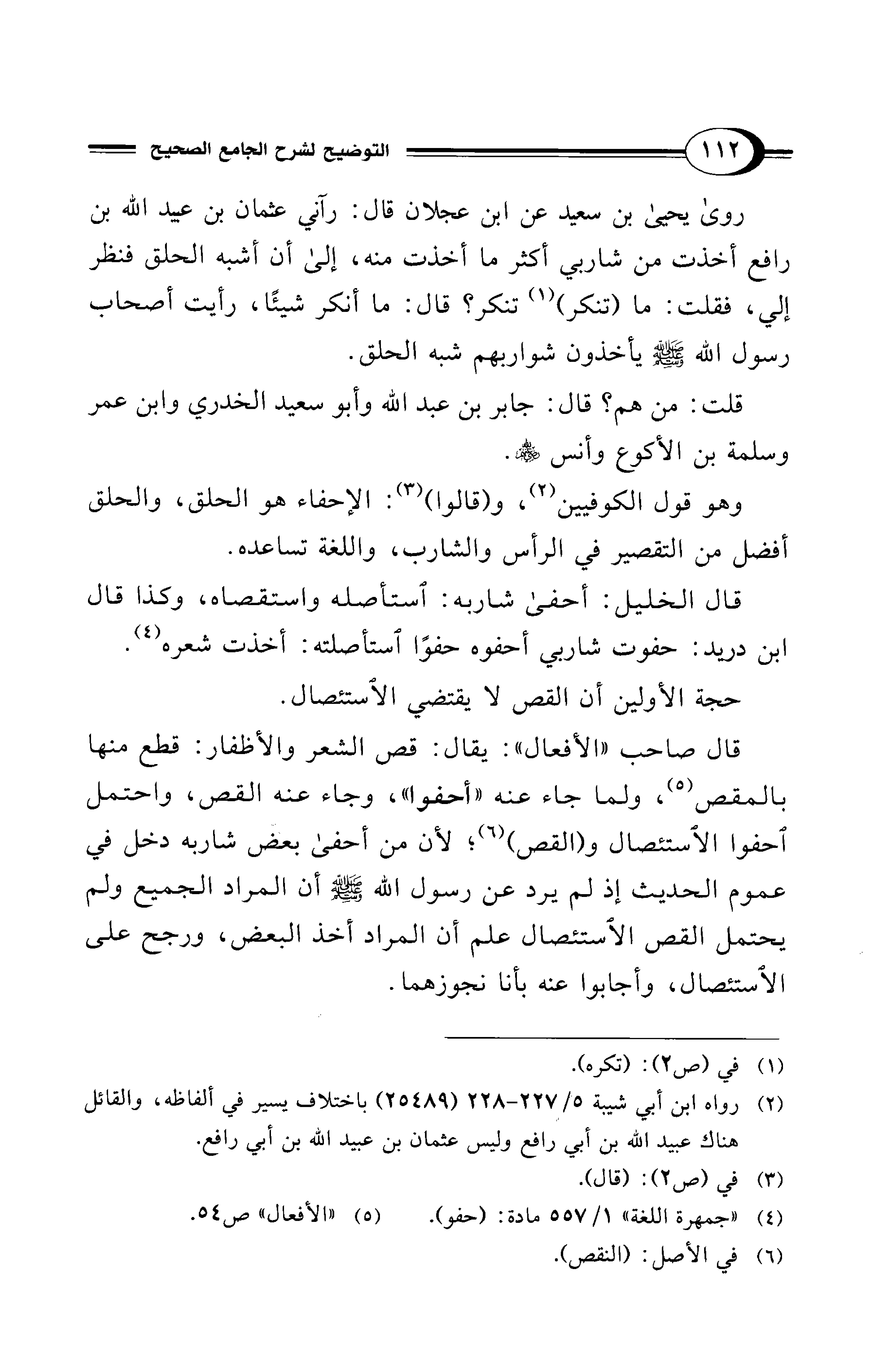 روى يحيى بن سعيد عن ابن عجلان قال: رآني عثمان بن عبيد الله بن رافع أخذت من شاربي أكثر ما أخذت منه، إلى أن أشبه الحلق فنظر إلى، فقلت: ما (تنكر) (¬1) تنكر؟ قال: ما أنكر شيئًا، رأيت أصحاب رسول الله - صلى الله عليه وسلم - يأخذون شواربهم شبه الحلق.