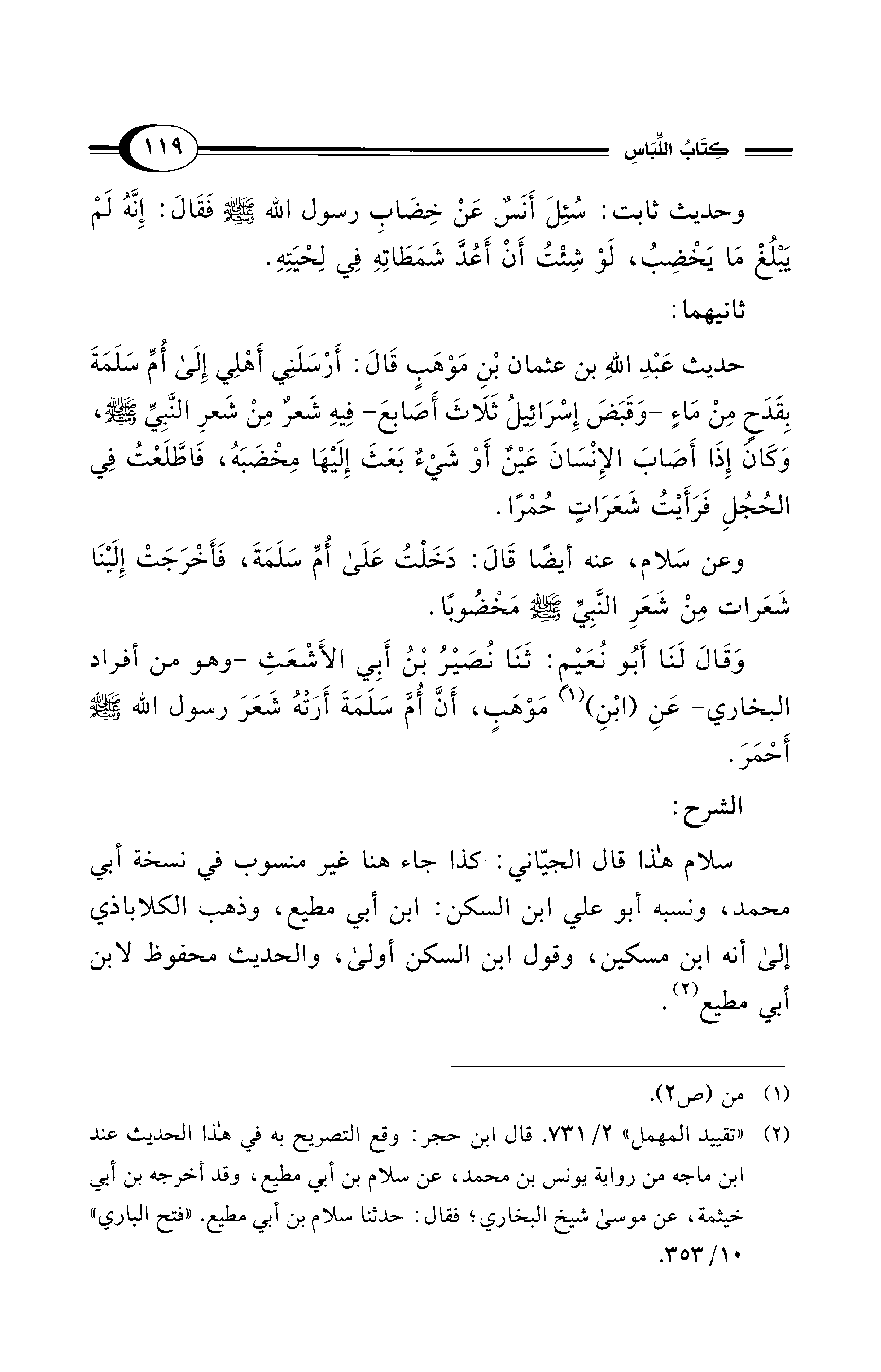وعن سَلام، عنه أيضًا قَالَ: دَخَلْتُ على أُمِّ سَلَمَةَ، فَأَخْرَجَتْ إِلَيْنَا شَعَرات مِنْ شَعَرِ النَّبِيِّ - صلى الله عليه وسلم - مَخْضُوبًا.