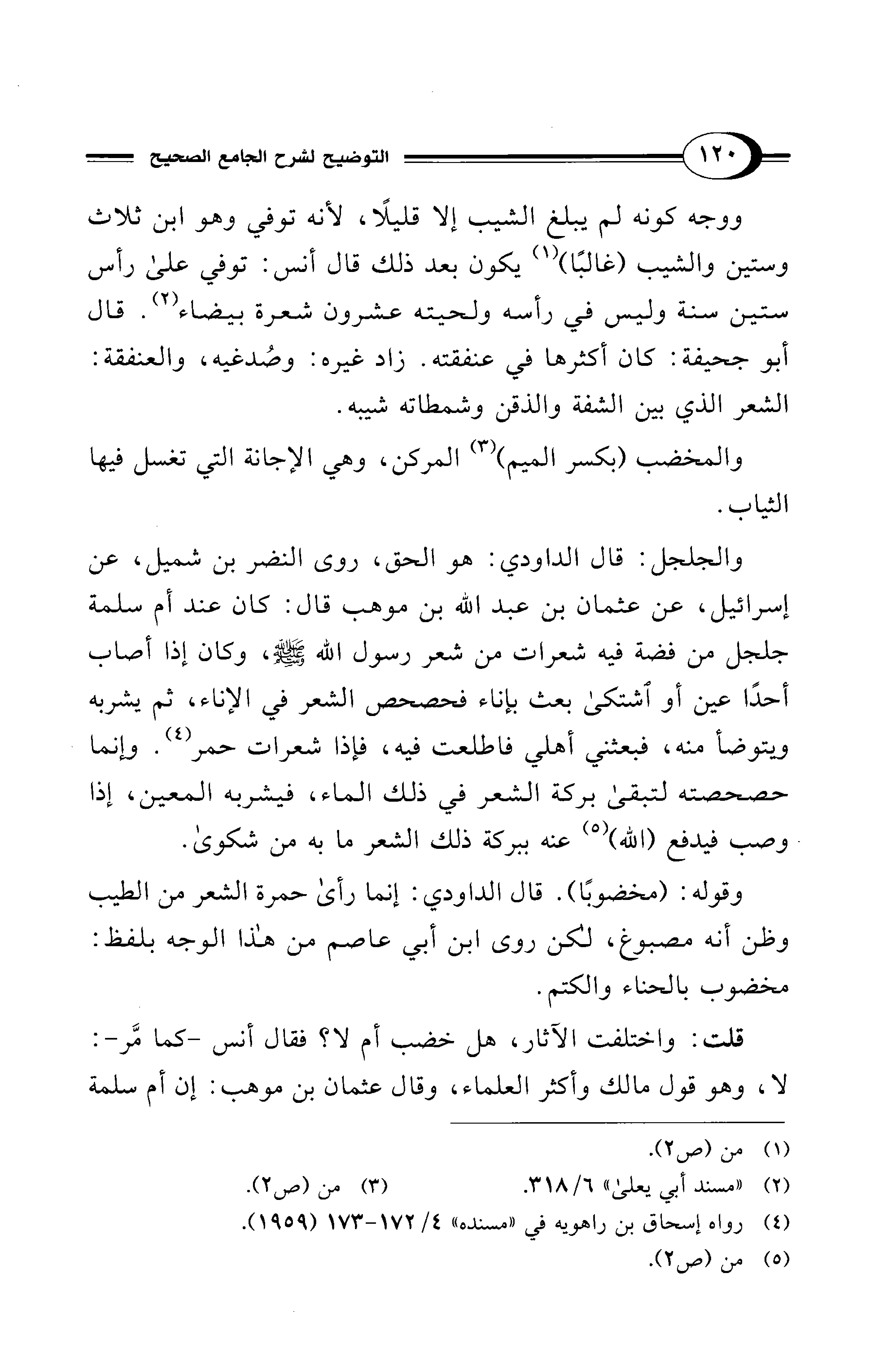 قلت: واختلفت الآثار، هل خضب أم لا؟ فقال أنس -كما مرَّ-: لا، وهو قول مالك وأكثر العلماء، وقال عثمان بن موهب: إن أم سلمة