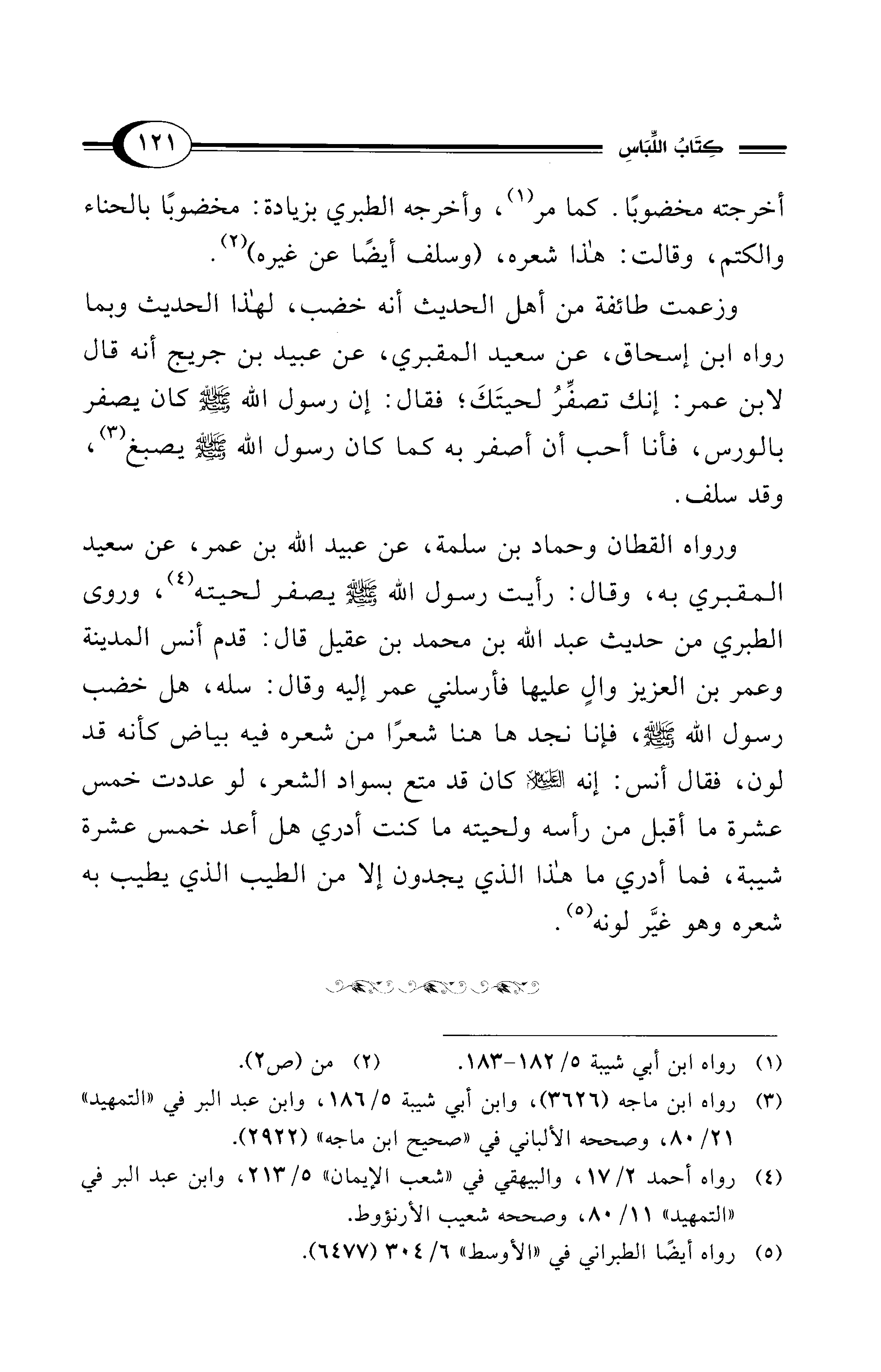 وزعمت طائفة من أهل الحديث أنه خضب، لهذا الحديث وبما رواه ابن إسحاق، عن سعيد المقبري، عن عبيد بن جريج أنه قال لابن عمر: إنك تصفِّرُ لحيتَكَ؛ فقال: إن رسول الله - صلى الله عليه وسلم - كان يصفر بالورس، فأنا أحب أن أصفر به كما كان رسول الله - صلى الله عليه وسلم - يصبغ (¬3)، وقد سلف.