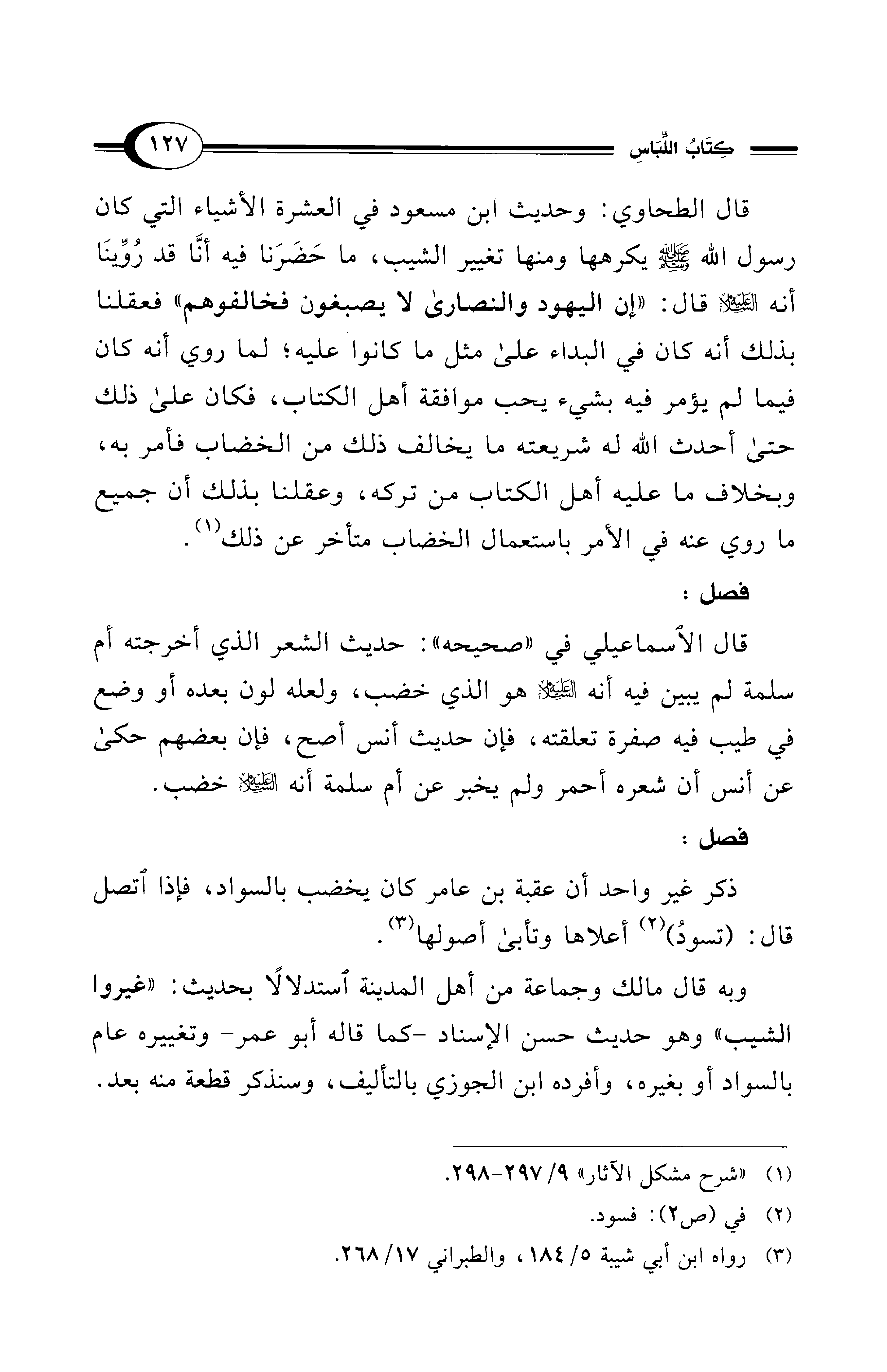 قال الطحاوي: وحديث ابن مسعود في العشرة الأشياء التي كان رسول الله - صلى الله عليه وسلم - يكرهها ومنها تغيير الشيب، ما حَضَرَنا فيه أنَّا قد رُوِّينَا أنه - عليه السلام - قال: "إن اليهود والنصارى لا يصبغون فخالفوهم" فعقلنا بذلك أنه كان في البداء على مثل ما كانوا عليه؛ لما روي أنه كان فيما لم يؤمر فيه بشيء يحب موافقة أهل الكتاب، فكان على ذلك حتى أحدث الله له شريعته ما يخالف ذلك من الخضاب فأمر به، وبخلاف ما عليه أهل الكتاب من تركه، وعقلنا بذلك أن جميع ما روي عنه في الأمر باستعمال الخضاب متأخر عن ذلك (¬1).