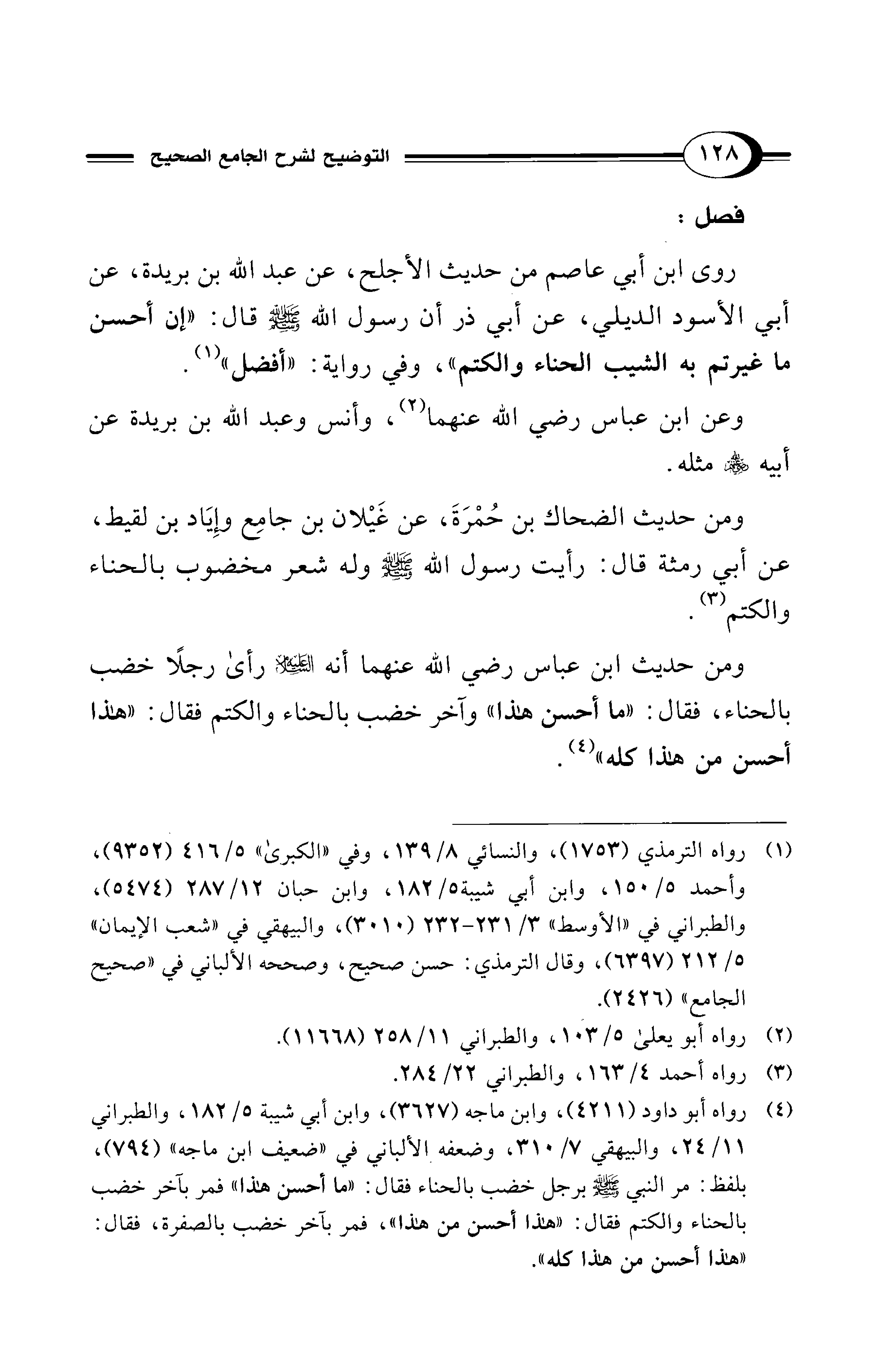 (¬4) رواه أبو داود (4211)، وابن ماجه (3627)، وابن أبي شيبة 5/ 182، والطبراني 11/ 24، والبيهقي 7/ 310، وضعفه الألباني في "ضعيف ابن ماجه" (794)، بلفظ: مر النبي - صلى الله عليه وسلم - برجل خضب بالحناء فقال: "ما أحسن هذا" فمر بآخر خضب بالحناء والكتم فقال: "هذا أحسن من هذا"، فمر بآخر خضب بالصفرة، فقال: "هذا أحسن من هذا كله".