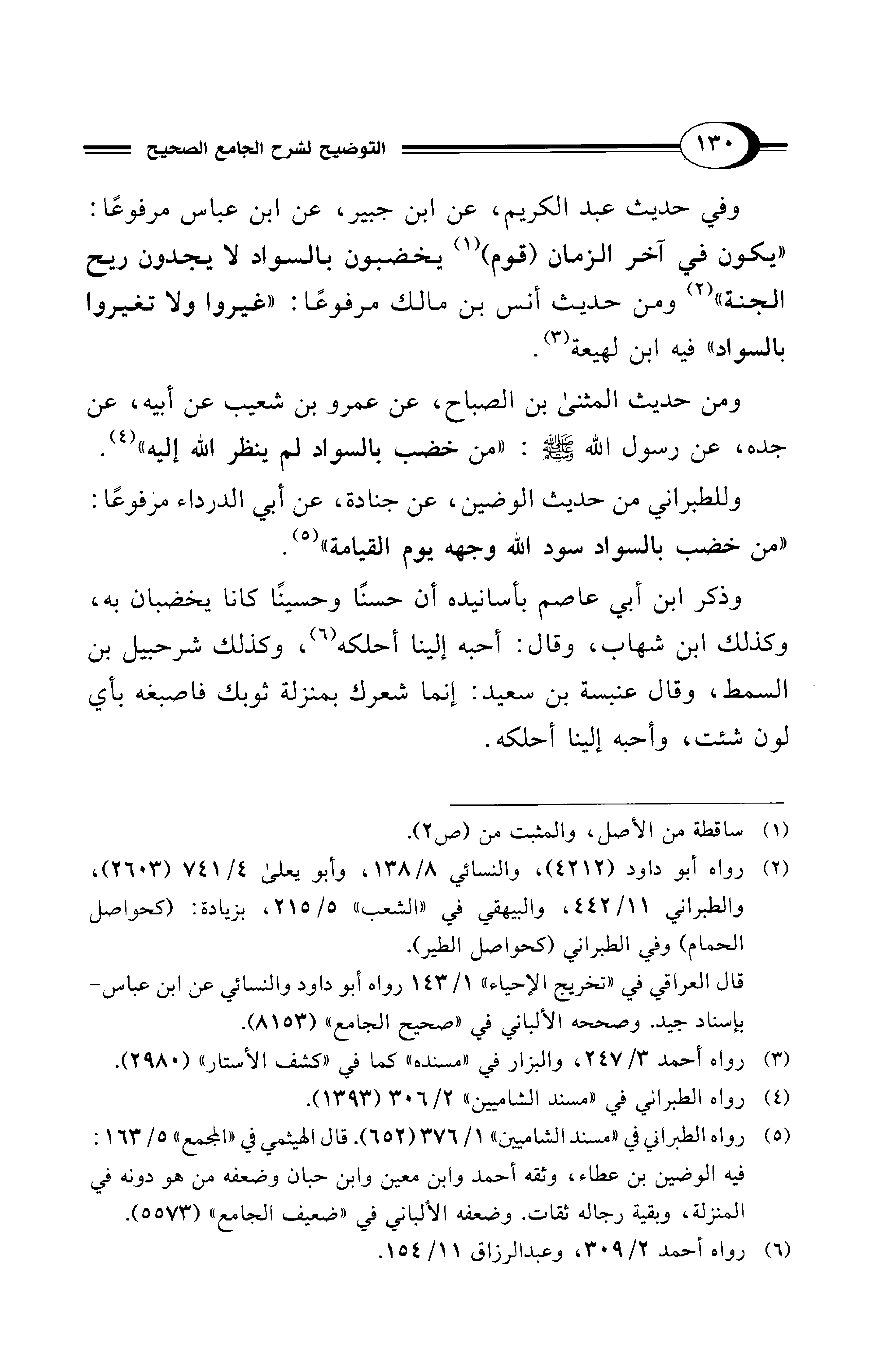 وفي حديث عبد الكريم، عن ابن جبير، عن ابن عباس مرفوعًا: "يكون في آخر الزمان (قوم) (¬1) يخضبون بالسواد لا يجدون ريح الجنة" (¬2) ومن حديث أنس بن مالك مرفوعًا: "غيروا ولا تغيروا بالسواد" فيه ابن لهيعة (¬3).