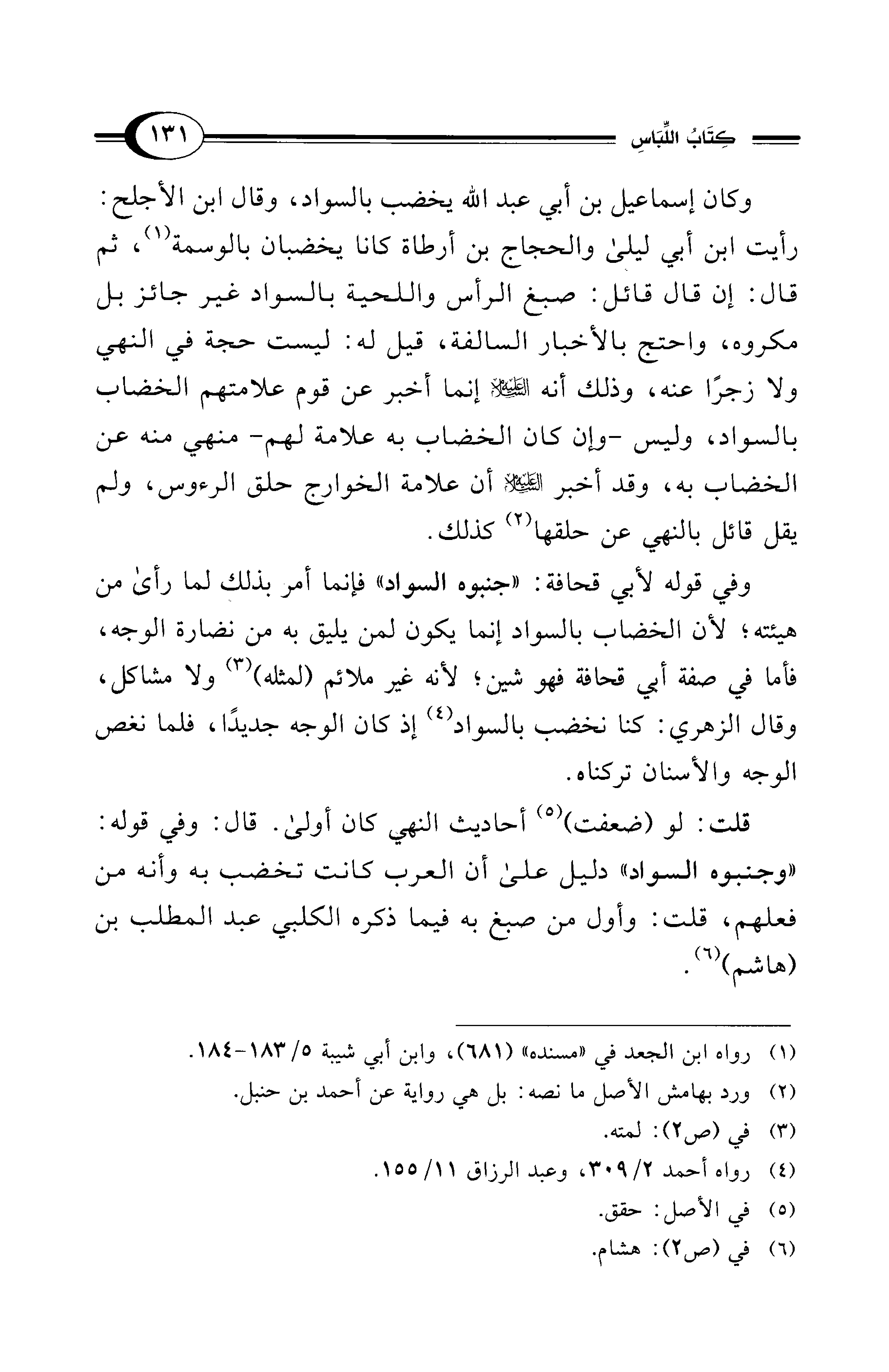 وكان إسماعيل بن أبي عبد الله يخضب بالسواد، وقال ابن الأجلح: رأيت ابن أبي ليلى والحجاج بن أرطاة كانا يخضبان بالوسمة (¬1)، ثم قال: إن قال قائل: صبغ الرأس واللحية بالسواد غير جائز بل مكروه، واحتج بالأخبار السالفة، قيل له: ليست حجة في النهي ولا زجرًا عنه، وذلك أنه - عليه السلام - إنما أخبر عن قوم علامتهم الخضاب بالسواد، وليس -وإن كان الخضاب به علامة لهم- منهي منه عن الخضاب به، وقد أخبر أن - عليه السلام - أن علامة الخوارج حلق الرءوس، ولم