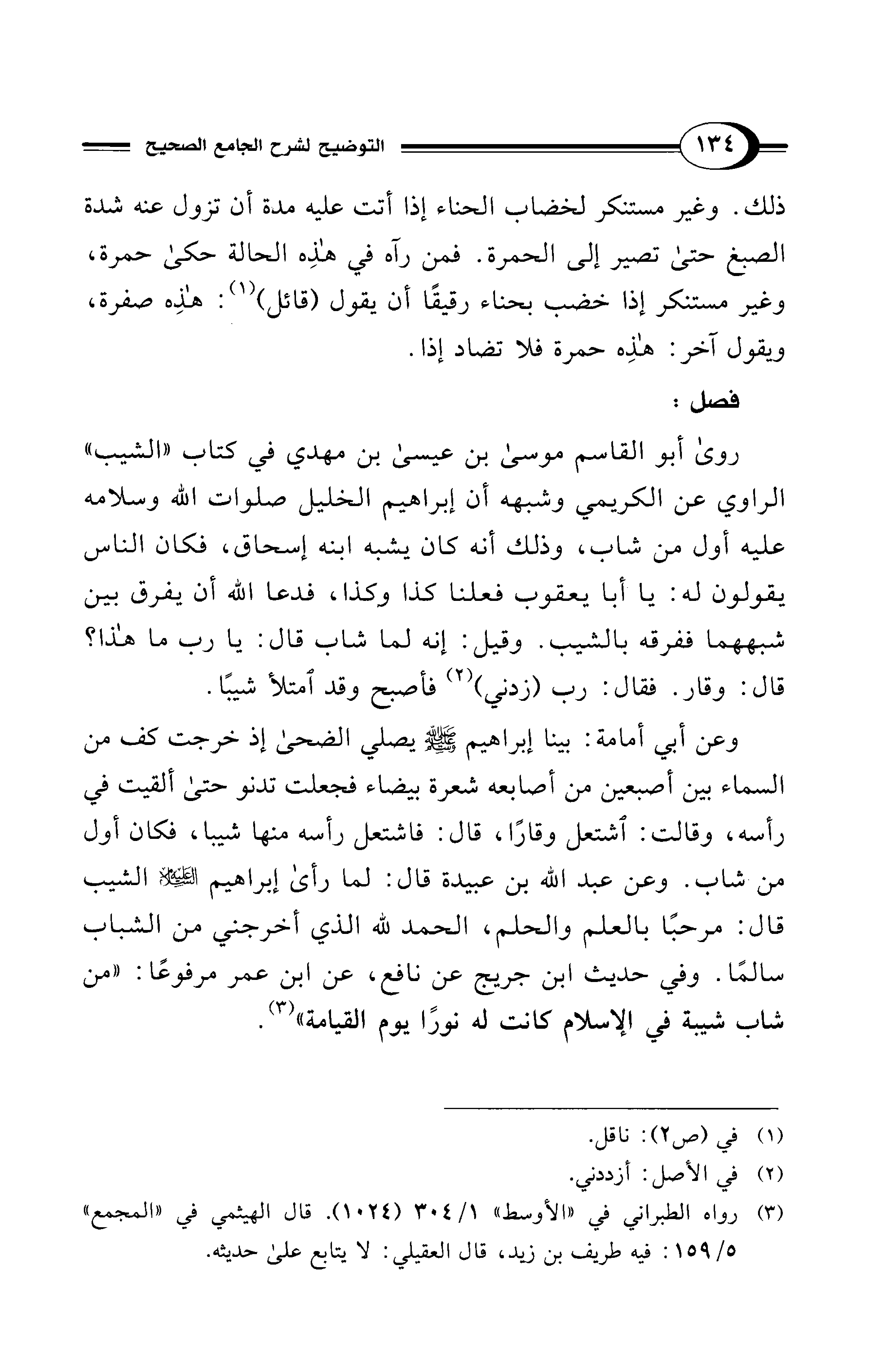 وعن أبي أمامة: بينا إبراهيم - صلى الله عليه وسلم - يصلي الضحى إذ خرجت كف من السماء بين أصبعين من أصابعه شعرة بيضاء فجعلت تدنو حتى ألقيت في رأسه، وقالت: اشتعل وقارًا، قال: فاشتعل رأسه منها شيبا، فكان أول من شاب. وعن عبد الله بن عبيدة قال: لما رأى إبراهيم - عليه السلام - الشيب قال: مرحبًا بالعلم والحلم، الحمد لله الذي أخرجني من الشباب سالمًا. وفي حديث ابن جريج عن نافع، عن ابن عمر مرفوعًا: "من شاب شيبة في الإسلام كانت له نورًا يوم القيامة" (¬3).