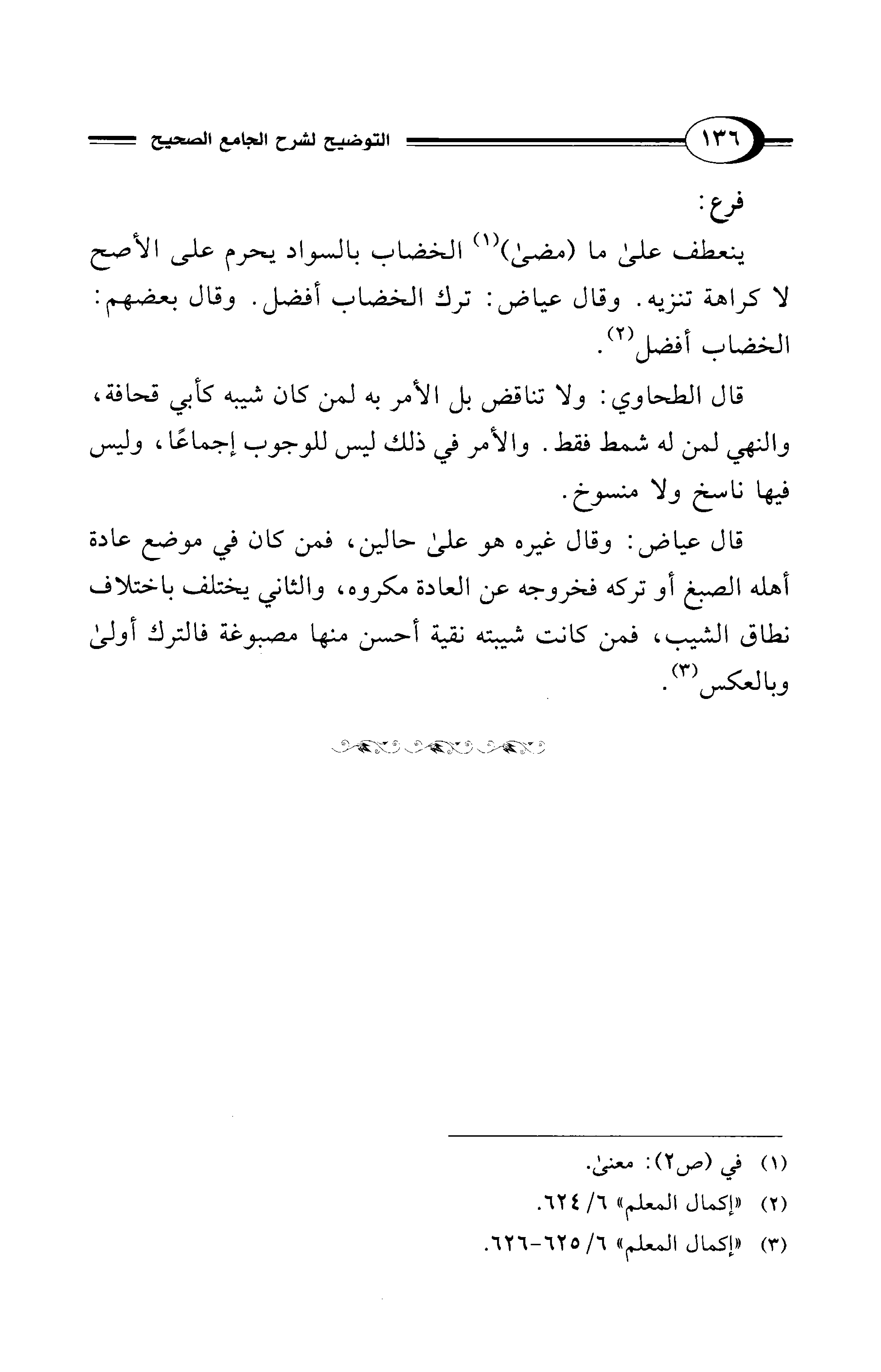 قال عياض: وقال غيره هو على حالين، فمن كان في موضع عادة أهله الصبغ أو تركه فخروجه عن العادة مكروه، والثاني يختلف باختلاف نطاق الشيب، فمن كانت شيبته نقية أحسن منها مصبوغة فالترك أولى وبالعكس (¬3).