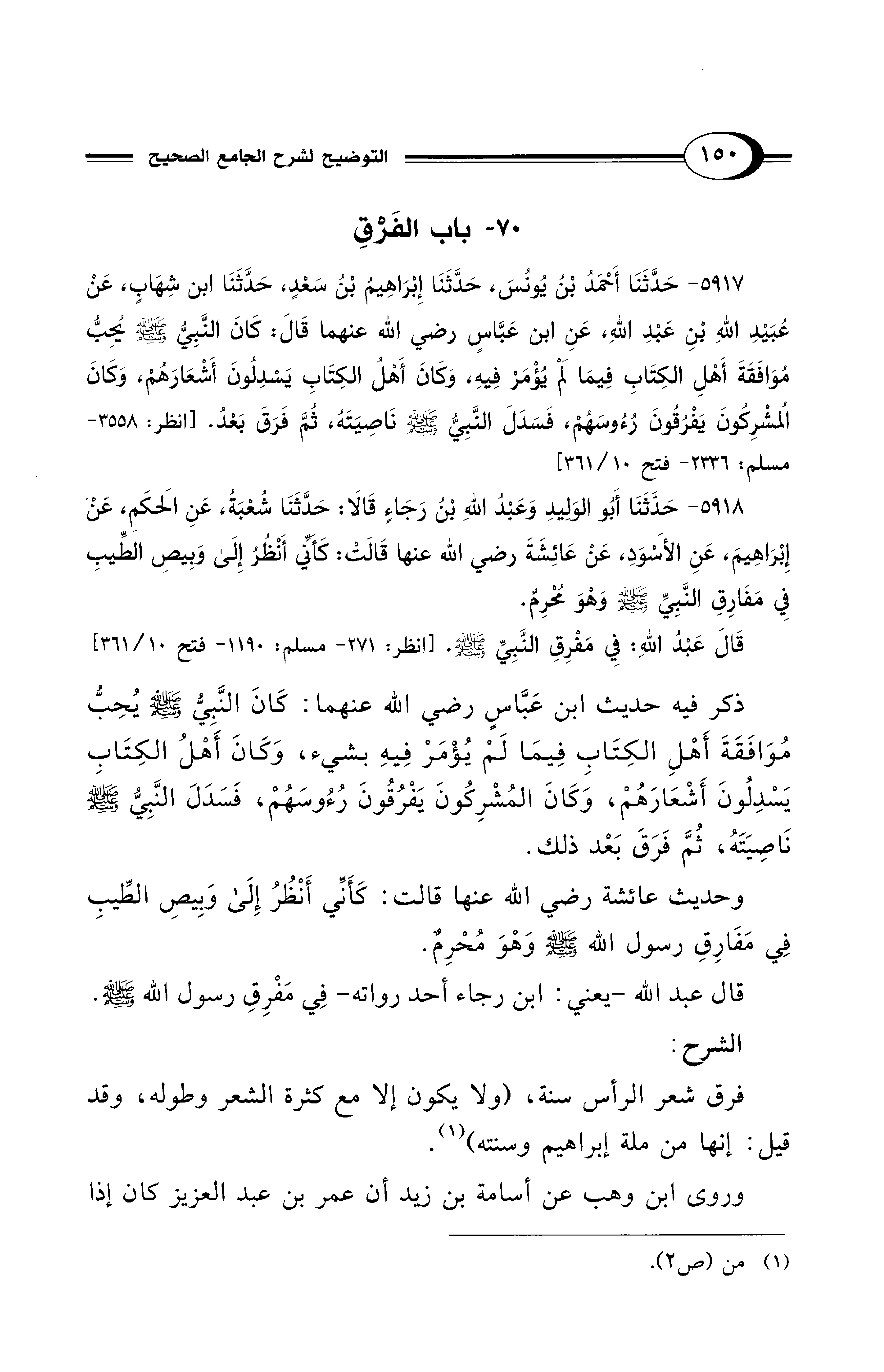 ذكر فيه حديث ابن عَبَّاسٍ - رضي الله عنهما -: كَانَ النَّبِيُّ - صلى الله عليه وسلم - يُحِبُّ مُوَافَقَةَ أَهْلِ الكِتَابِ فِيمَا لَمْ يُؤْمَرْ فِيهِ بشيء، وَكَانَ أَهْلُ الكِتَابِ يَسْدِلُونَ أَشْعَارَهُمْ، وَكَانَ المُشْرِكُونَ يَفْرُقُونَ رُءُوسَهُمْ، فَسَدَلَ النَّبِيُّ - صلى الله عليه وسلم - نَاصِيَتَهُ، ثُمَّ فَرَقَ بَعْد ذلك.