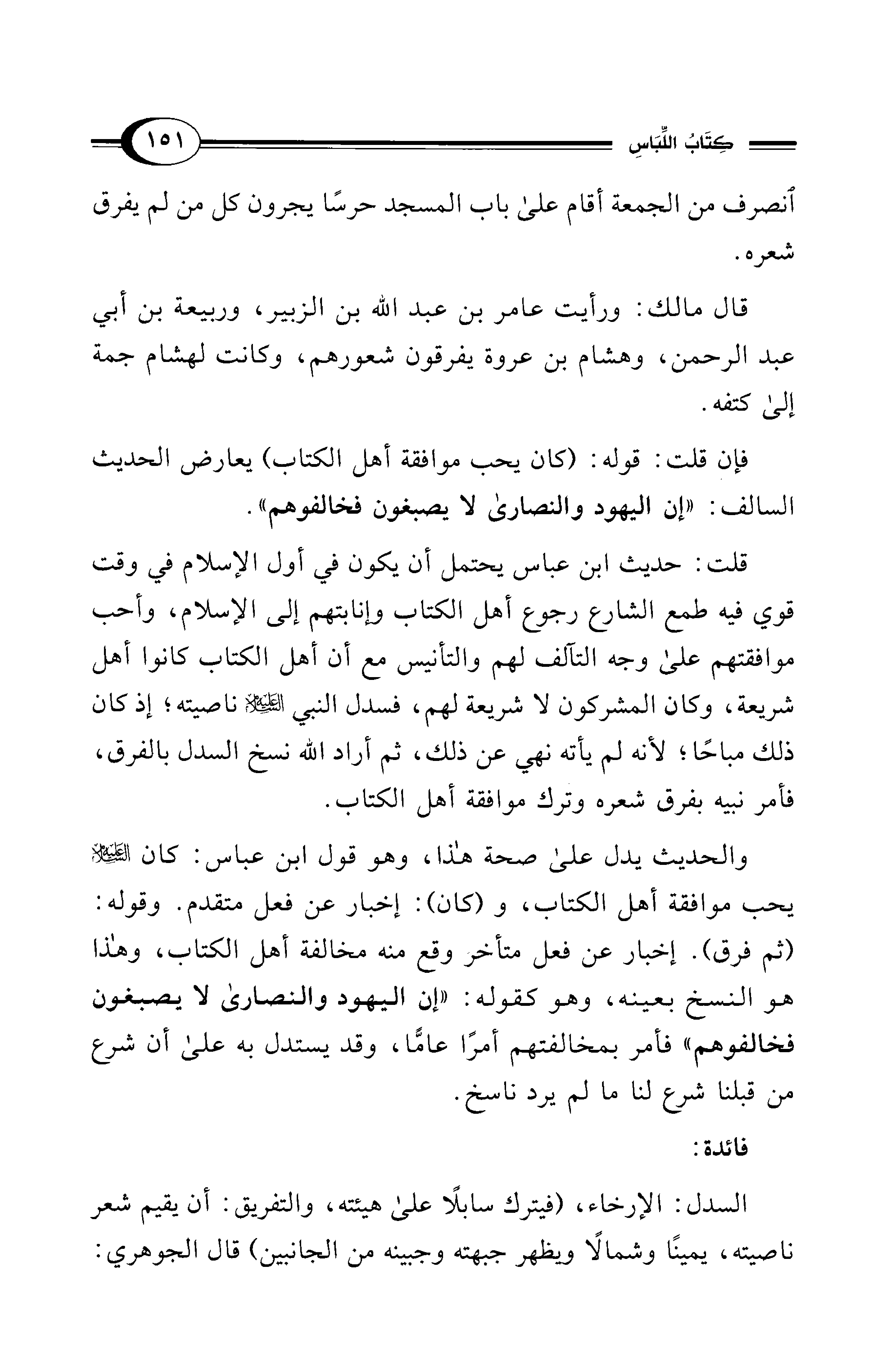 قلت: حديث ابن عباس يحتمل أن يكون في أول الإسلام في وقت قوي فيه طمع الشارع رجوع أهل الكتاب وإنابتهم إلى الإسلام، وأحب موافقتهم على وجه التآلف لهم والتأنيس مع أن أهل الكتاب كانوا أهل شريعة، وكان المشركون لا شريعة لهم، فسدل النبي - عليه السلام - ناصيته؛ إذ كان ذلك مباحًا؛ لأنه لم يأته نهي عن ذلك، ثم أراد الله نسخ السدل بالفرق، فأمر نبيه بفرق شعره وترك موافقة أهل الكتاب.